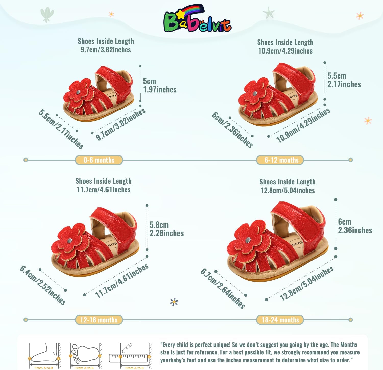 Every baby is unique! The Months size is just for reference, please measure your baby’s foot for the best possible fit.