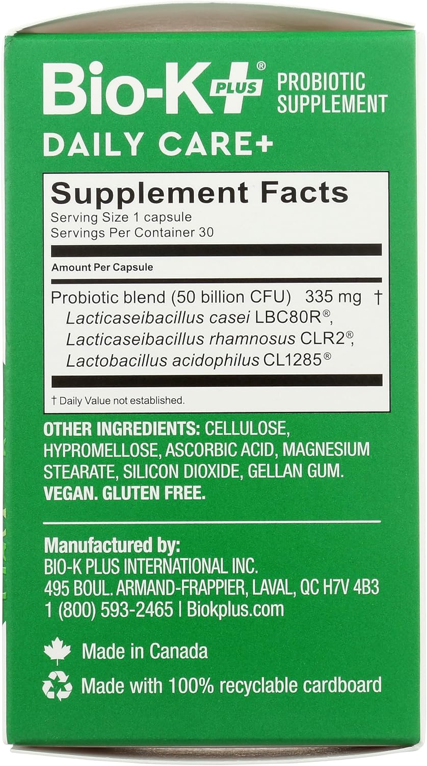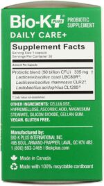 Bio-K + Daily Care Plus Probiotic Supplement Capsules for Adult Men and Women, 50 Billion Active Bacteria, Promotes Immune System Health – Vegan & Gluten-Free Delayed Release, 30 Capules/Box