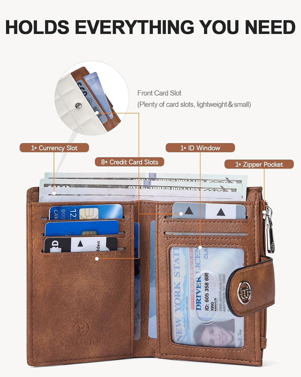 PRACTICAL DESIGN: Leather bifold wallet comes with 8 credit card slots, 1 ID window, 1 currency slot, 1 zipper pocket for change. Roomy enough for fitting plenty of cards, change and some bills, coins, keep them well organized. Ladies wallet’s card slot has been tested many times and is easy to get your cards in and out. The zipper of the RFID wallet women has been tested several times and must be smooth and not stuck.