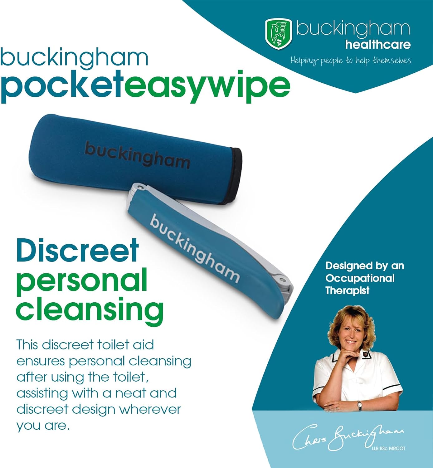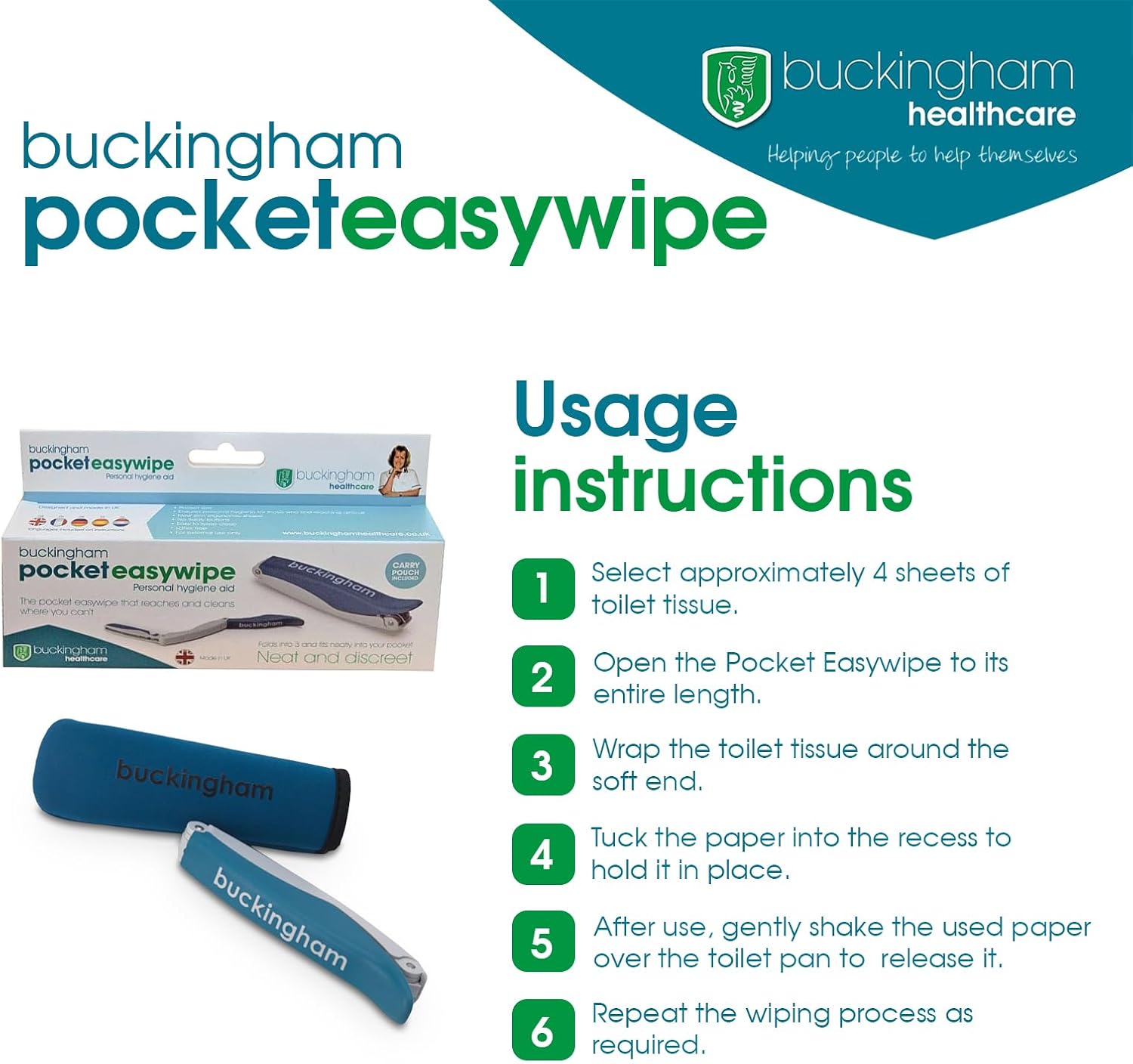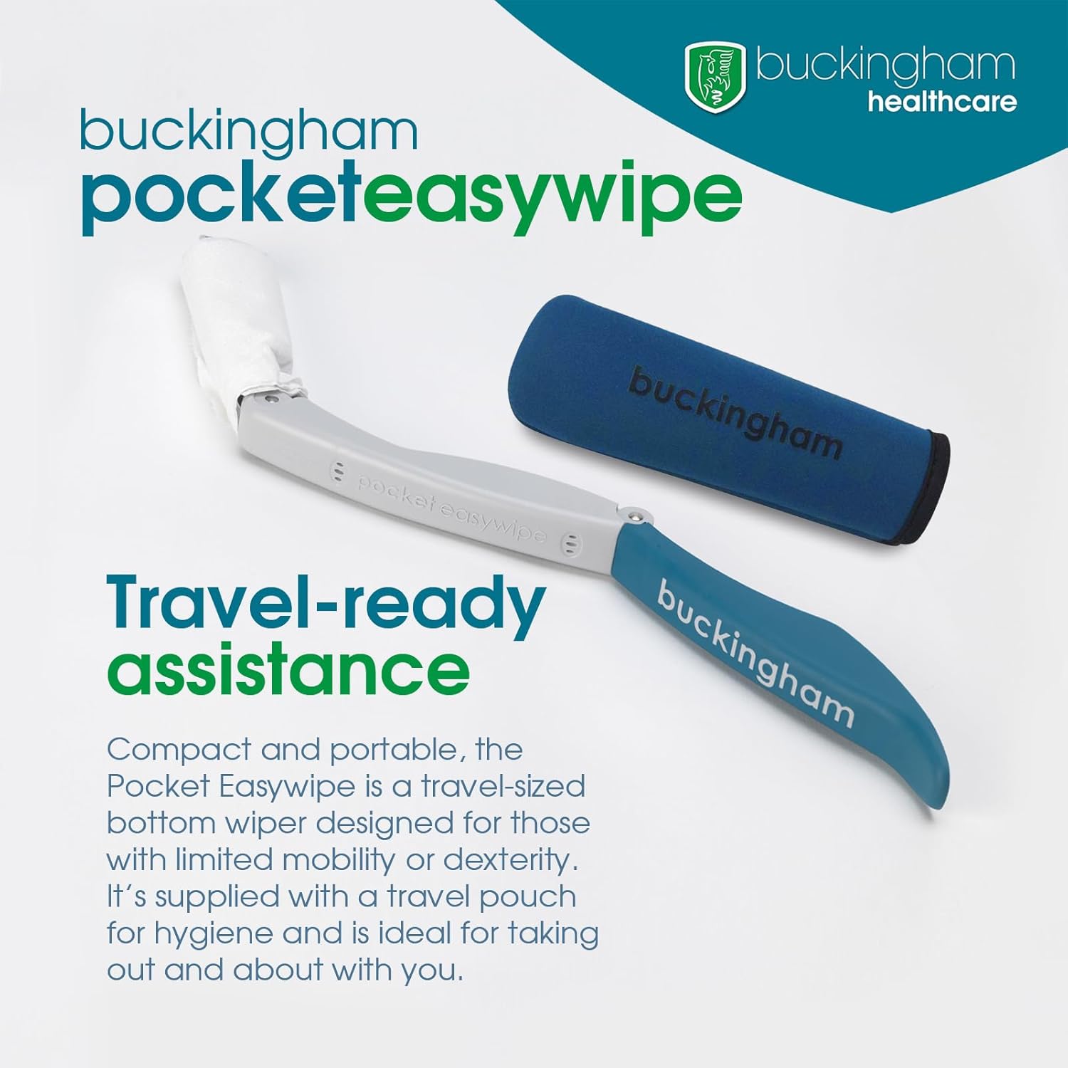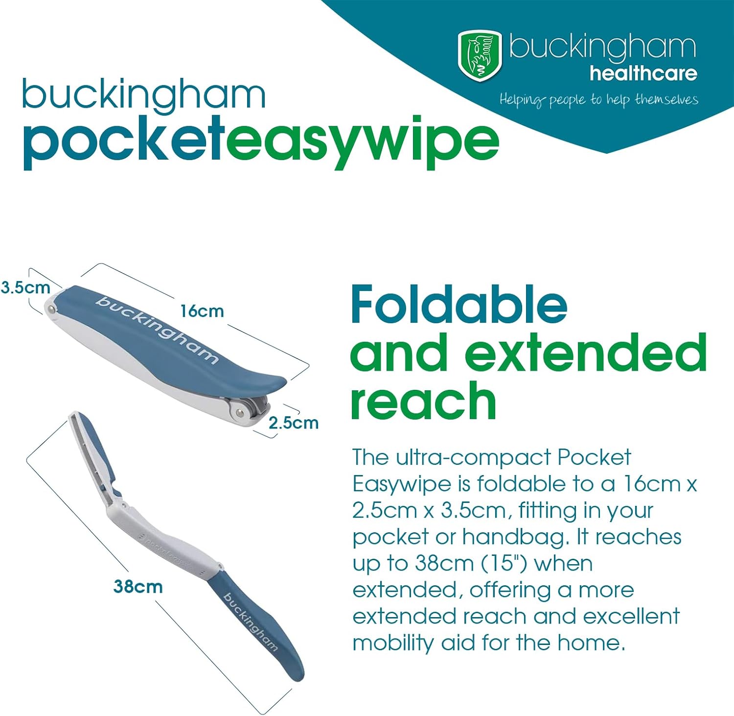 “Buckingham Pocket Easywipe Personal Hygiene Aid The Buckingham Pocket Easywipe is a bottom wiping aid designed to assist anyone with limited mobility with personal cleansing after using the toilet. It works very well with either flushable wipes or toilet tissue. The Pocket-sized Folding Bottom Wiping Aid The Pocket Easywipe is the latest innovation in the Buckingham Easywipe range of bottom wipers. It folds down into just 16cm (6 ¼””), x 2.5cm (1″”) x 3.5cm (1 ½””), making it the most compact and discreet bottom wiping aid on the market. It can easily fit in your pocket or handbag, so you can have it to hand whenever and wherever you need it. Long Reach Bottom Wiping Aid Not only it the Pocket Easywipe ultra compact, it also extends to 38cm / 15” giving you a longer reach than other bottom wipers. Comfortable and Easy to Use The soft touch handle is easy to grip and hold and the toilet tissue is securely gripped during use. Once you’ve used the toilet tissue it then can be dropped into the toilet easily by gently shaking the bottom wiping aid. Versatile Personal Hygiene Aid The Pocket Easywipe is a versatile perosnal hygiene aid. It can be used to clean the l and area after using the toilet and can be used between the legs, from the front or from behind, whilst seated on the toilet. This makes it ideal if you have restricted movement or limited mobility. Hygienic Design The Bottom Wiping Aid is supplied with a soft carry pouch for hygiene which also makes it very discreet. The Pocket Easywipe has a soft, smooth and rounded design which makes it comfortable to use and easy to clean.”