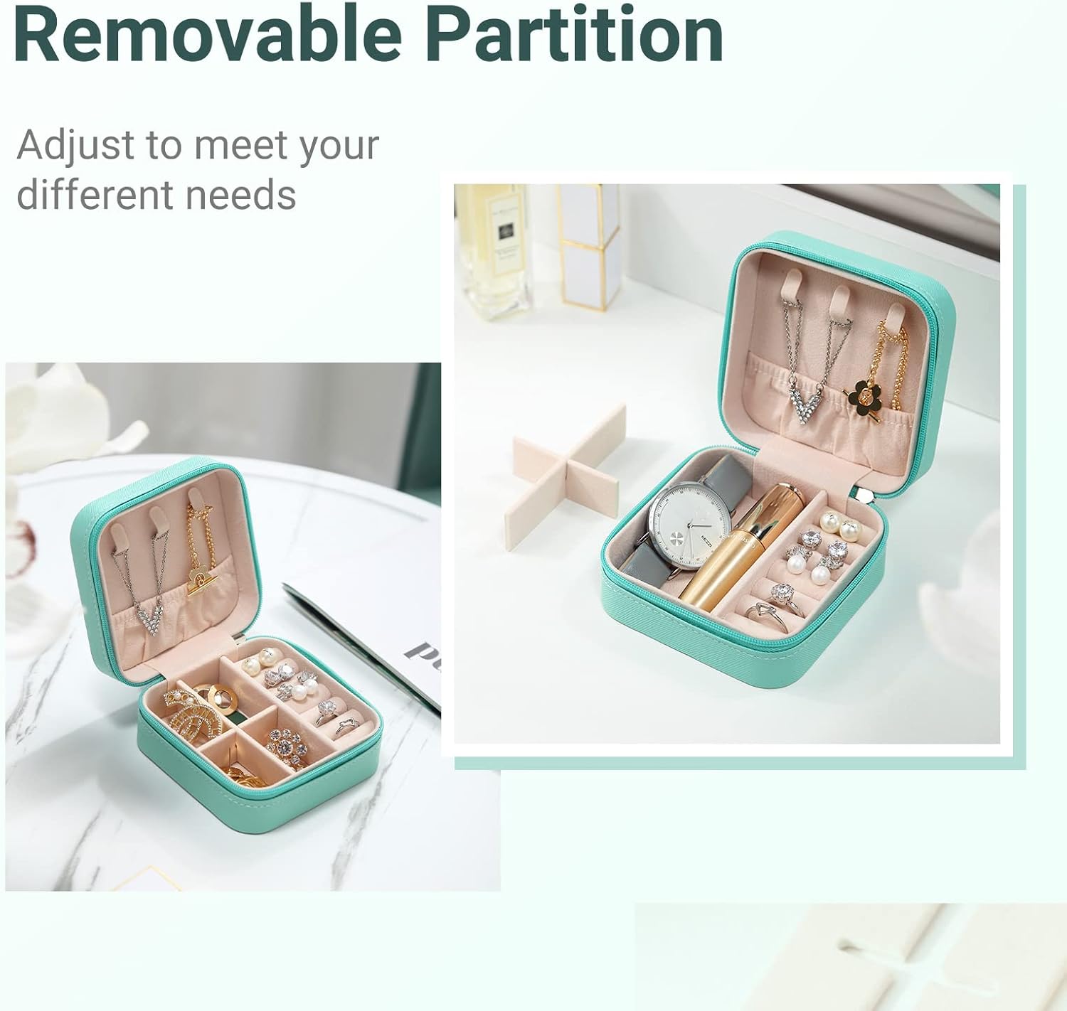 Suitable Capacity: Travel jewelry organizer provides necklace hooks, ring grooves, removable partition design to meet different needs. Make all kinds of jewelry are neatly and orderly storaged.