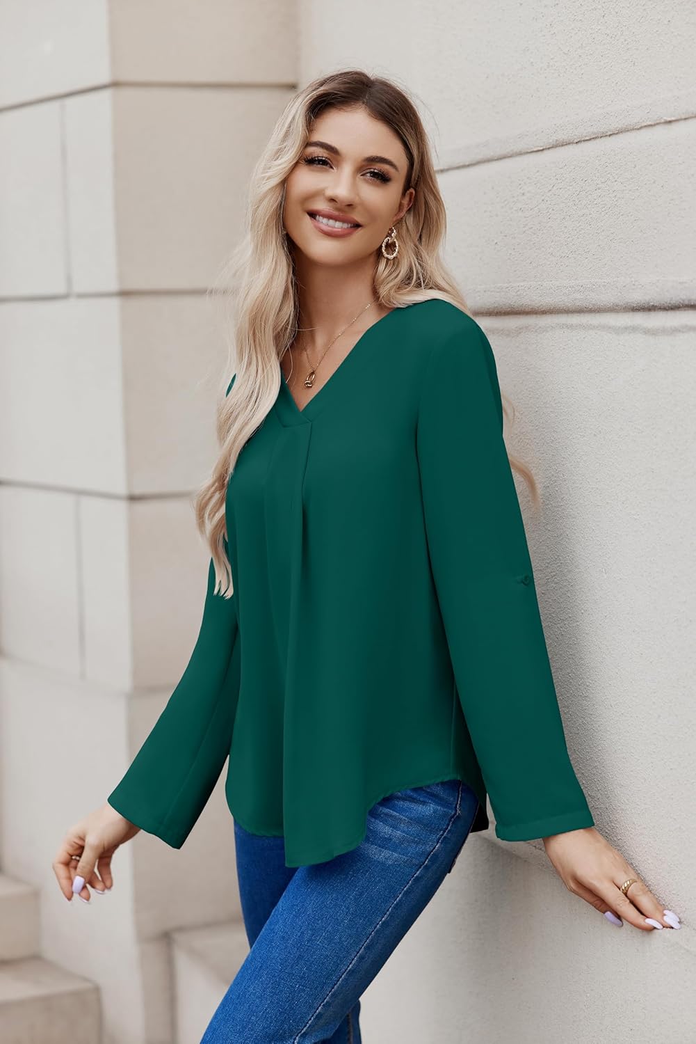 Versatile: The womens dressy tops and blouses features a flattering V-neck cut that subtly enhances your figure without being overly revealing. Its slight A-line fit adds a touch of femininity and comfort to your look. The solid color and loose fit design make this blouse incredibly versatile, easily paired with leggings, skinny jeans