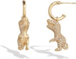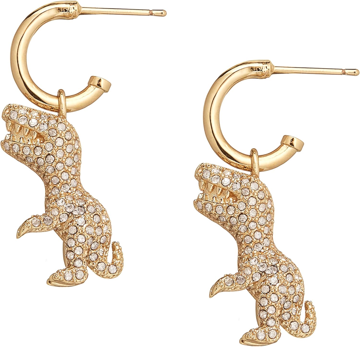 Refined huggie earrings featuring three-dimensional signature Rexy dino mascot dangling charm adorned with minimal pavé and hypoallergenic titanium posts. Earrings have a post back closure. Made from polished brass metal, glass crystal and titanium. Includes signature COACH jewelry pouch.