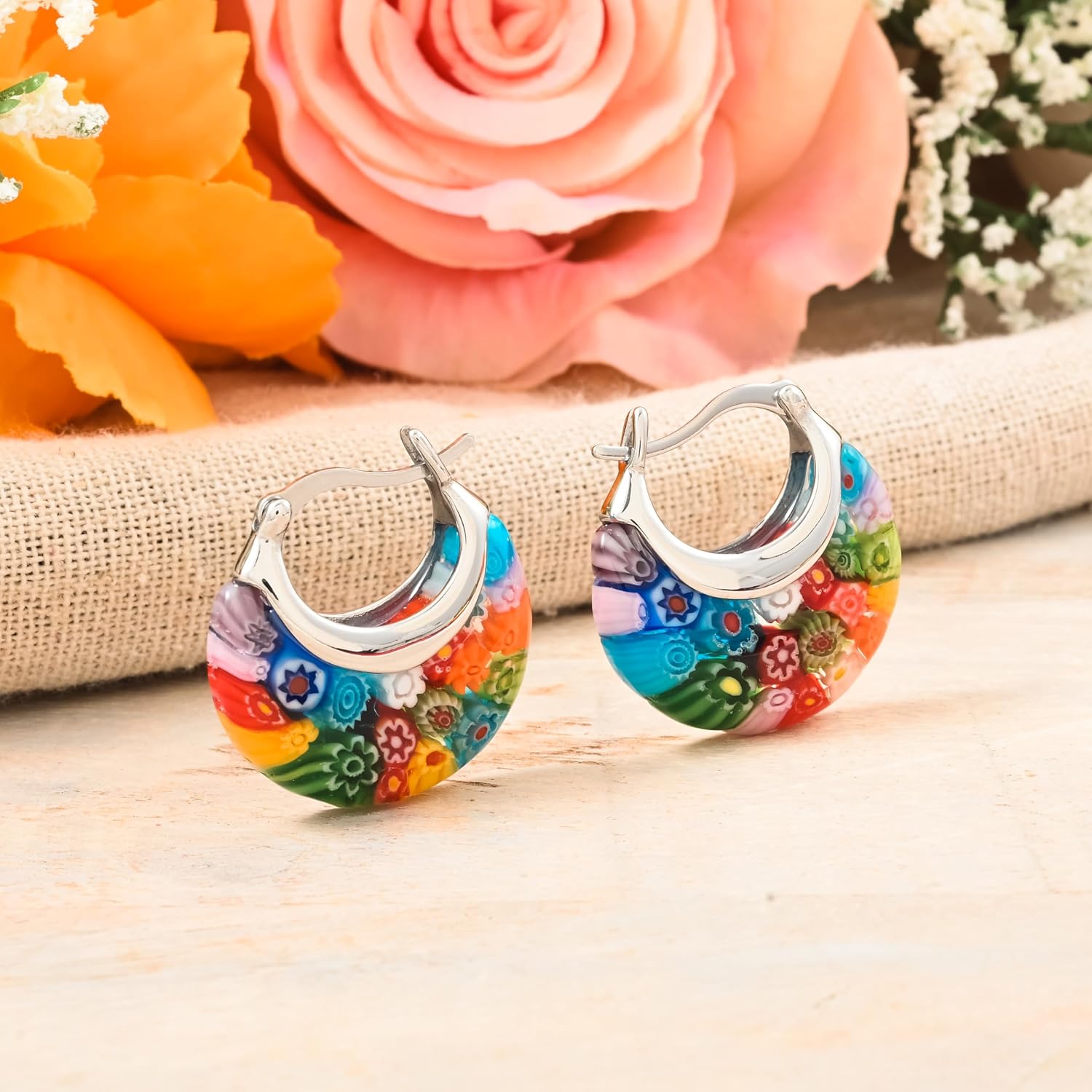 Be the first to review “Colorful Murano Style Millefiori Glass Hoop Earrings for Women Daisy Flower Stainless Steel Jewelry Trendy Birthday Gifts for Women 11.6 Gms” Cancel reply