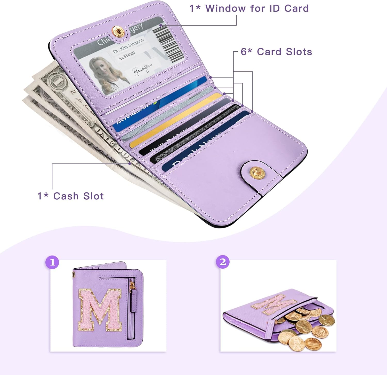 COSHAYSOO Initial Wallet RFID Small Bifold Slim Letter Wallet for Women Teenager Girls Travel Daily Necessities Credit Cards Money Cash Coin Organizer, Lavender, Compact, M