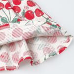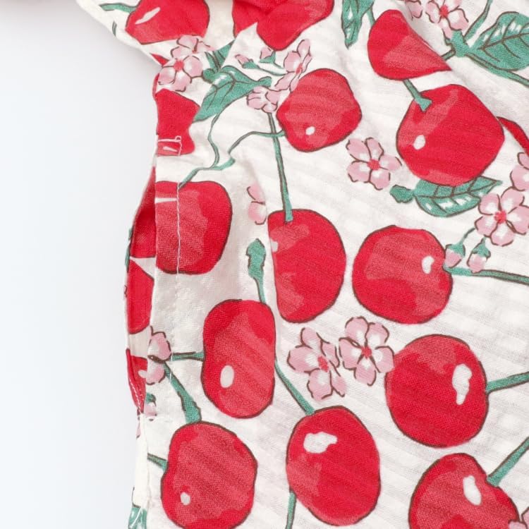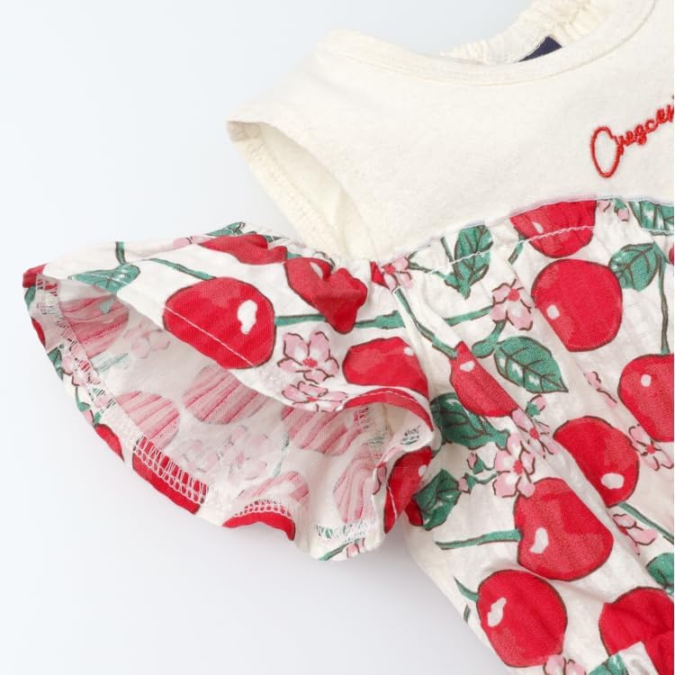 This dress has a cool pattern of soccer material with cherries and lemon patterns. The off-the-shoulder design and embroidered logo make it mature and cute