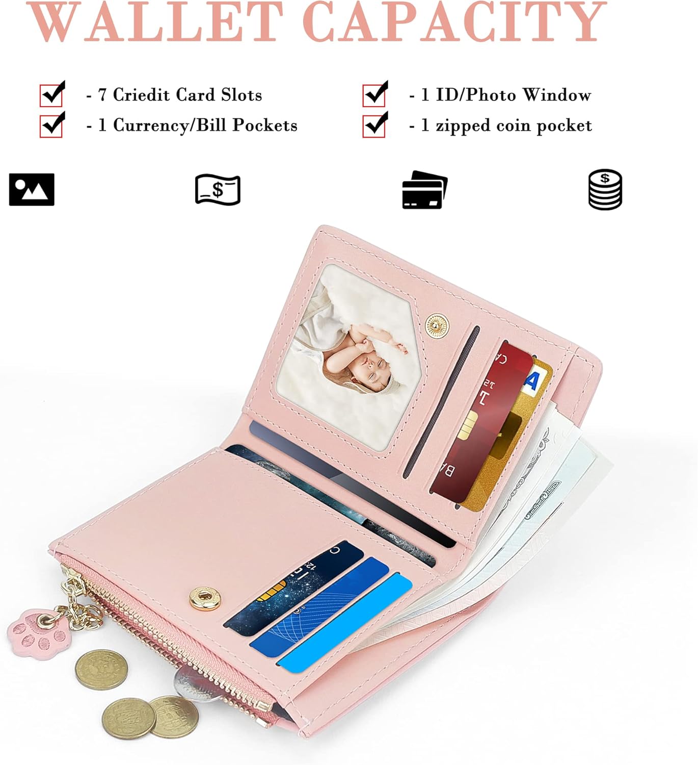 ღ Compact Practical – This slim wallet for women features 1 ID window, 1 Zipper coin purse, 7 Credit card slots,1 big bill compartment. well secure all your belongings and small stuff. You can use this cute wallets to carry credit cards, cash, student IDs, Driver’s License, coins and family photo.