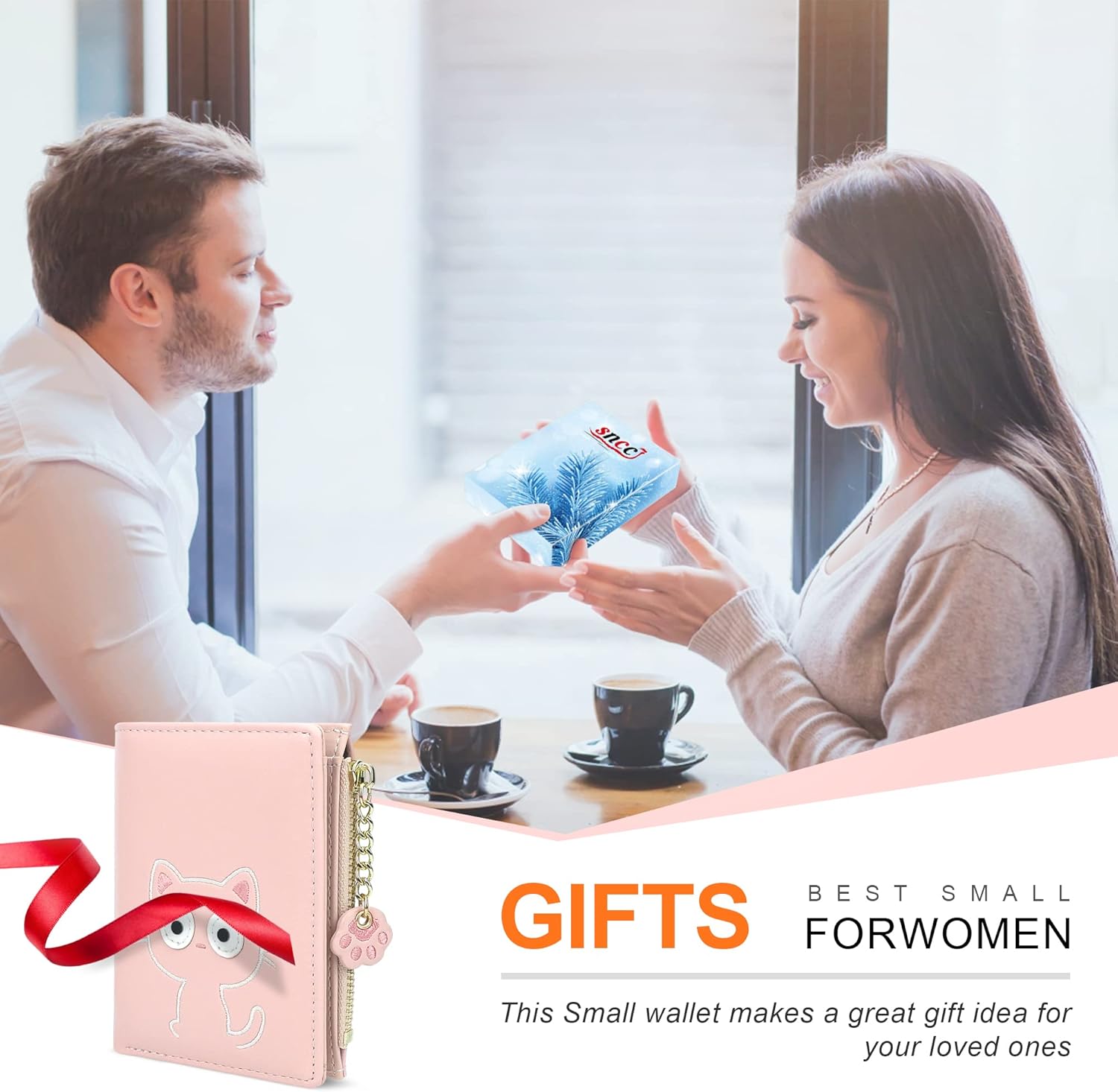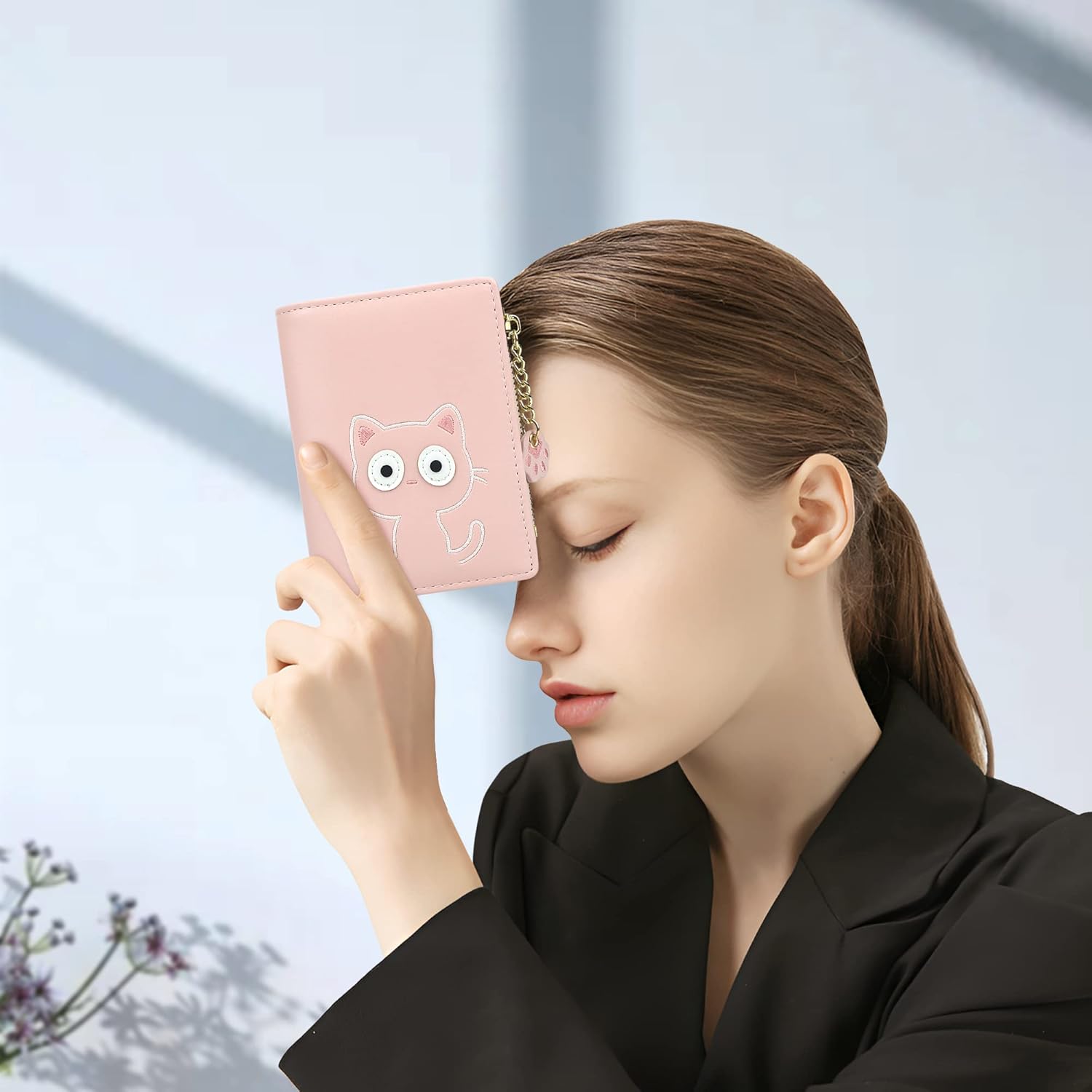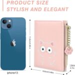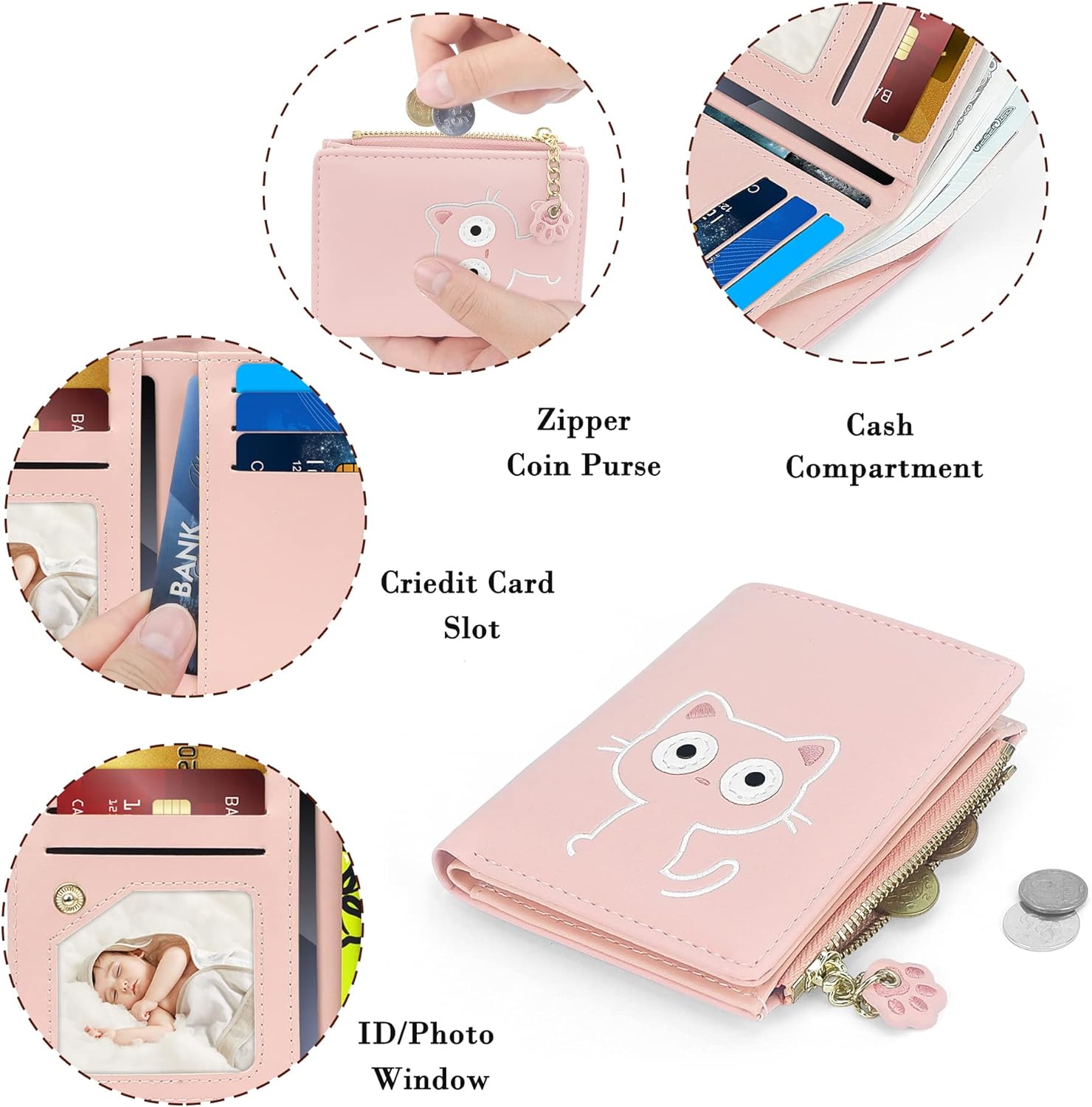 Cute Wallets for Women, Bifold RFID Blocking Small Womens Wallet with Zipper Coin Pocket, Pink Embroidered Cat, Small, Fashion