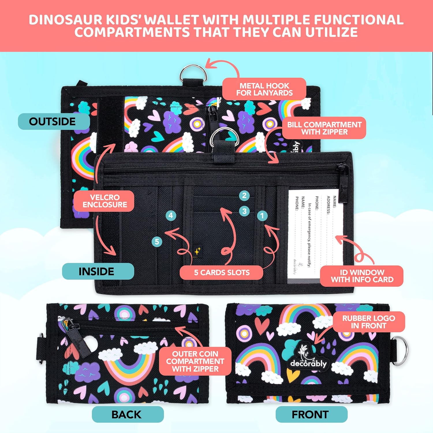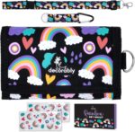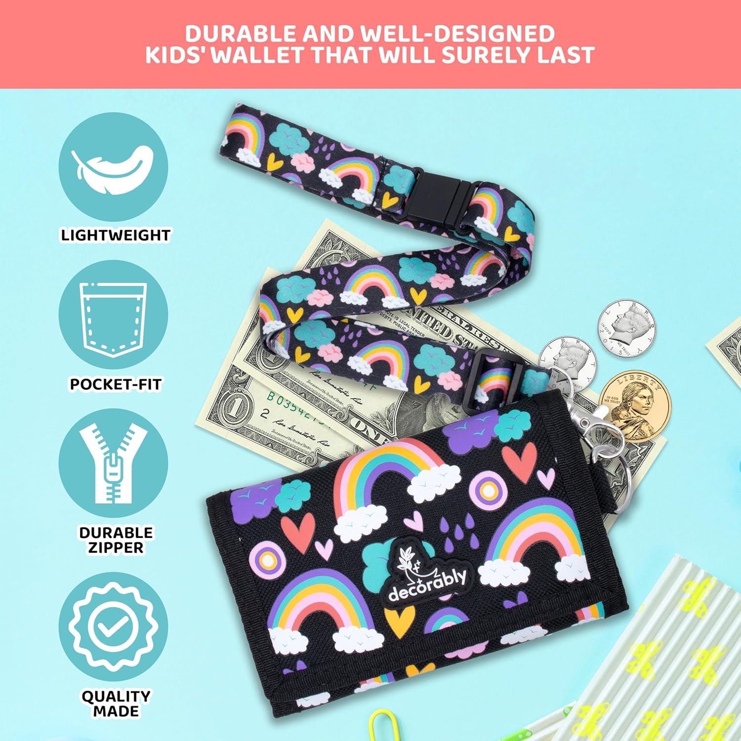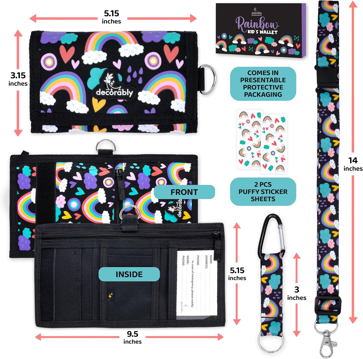 FUN MATCHING INCLUSIONS – Elevate the fun factor of these girls wallets for kids 4-6 with two included lanyards, perfect for keeping it secure and easily accessible, along with two sheets of puffy stickers, all featuring matching rainbow designs.
