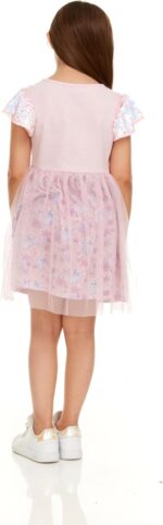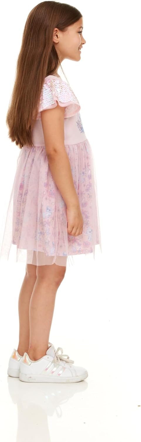 For an extra dose of sparkle and glamour, the screen-printed graphics on the bodice are enhanced with a glitter process, adding shimmer and shine to every movement. The sequin tulle shoulder sleeves elevate the look with a touch of elegance and playfulness, making this dress perfect for special occasions or everyday adventures.