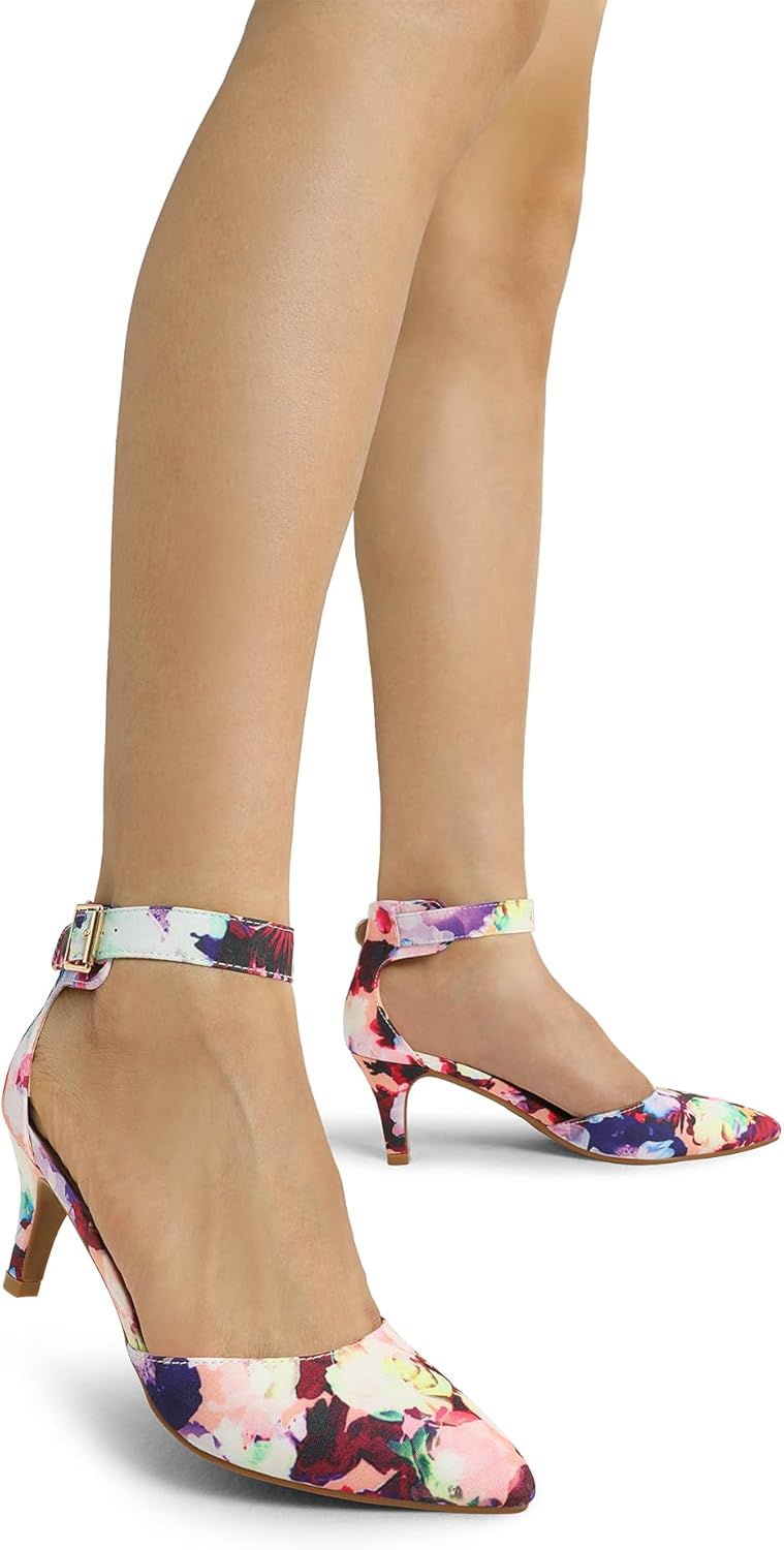Feel comfortable with every step you take with these cute low heel pointed pump! Pointed-toe heels are designed in smooth vegan leather/textile and feature pointed toe, exposed sides, and an adjustable buckled ankle strap. Finished with a stiletto heel and cushioned insole for comfort.