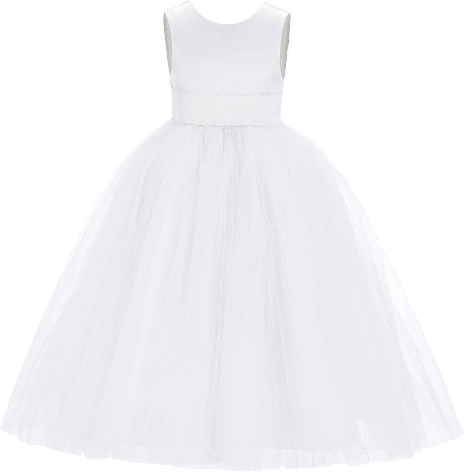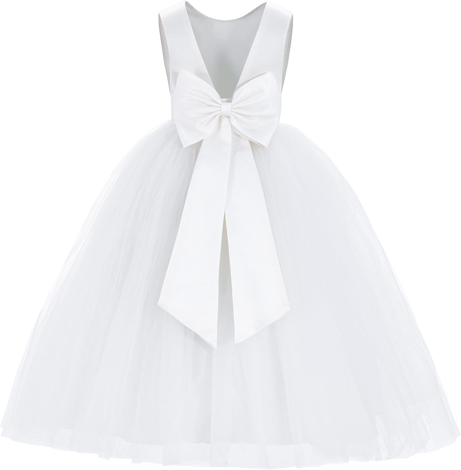 This gorgeous flower girl dress features a open back satin bodice with elegant tulle skirt. The waistline is delicately decorated with a removable satin tiebow.