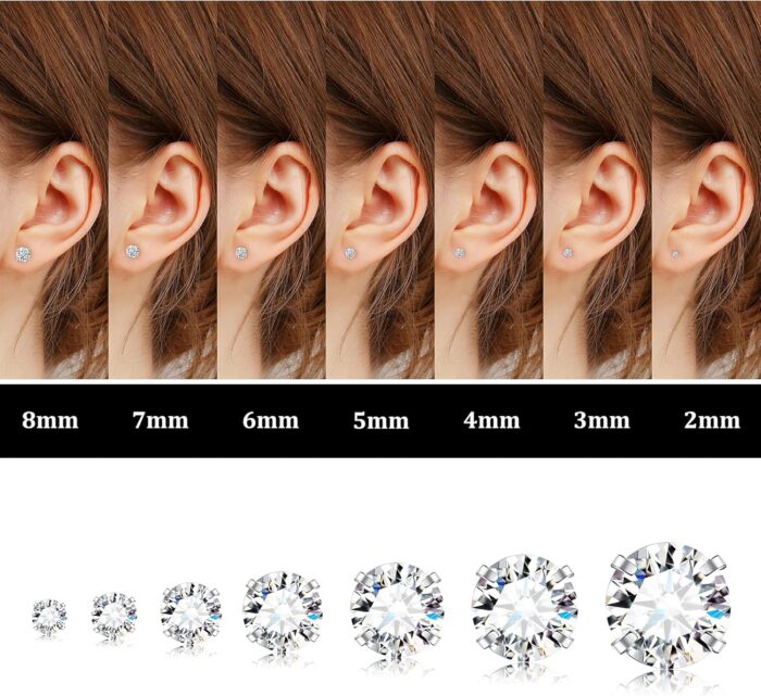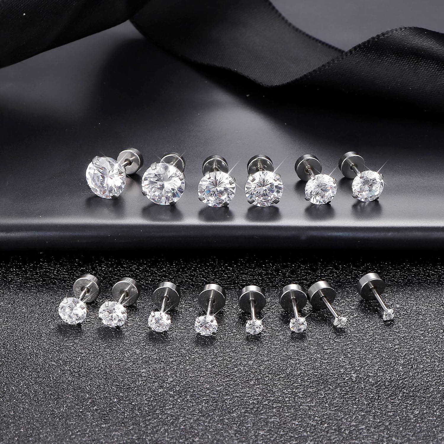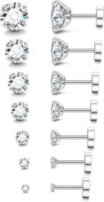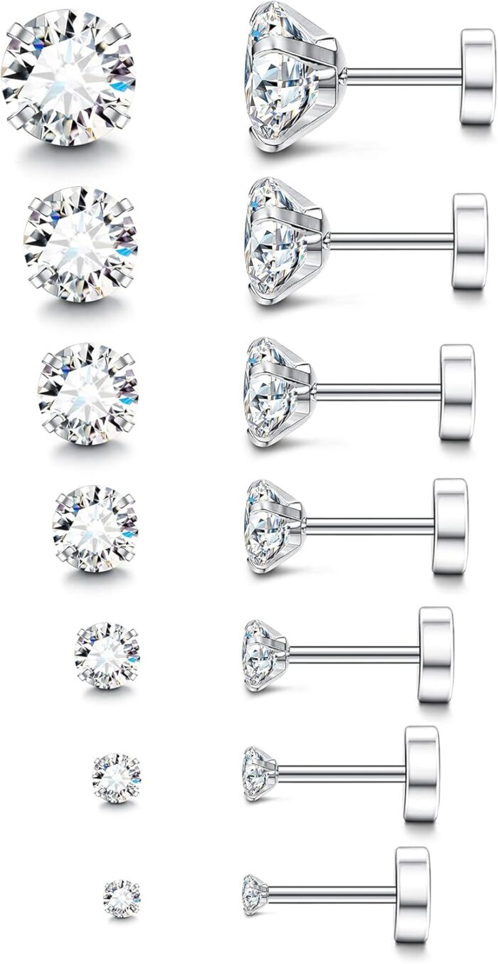 Discover the Fansilver 20G Hypoallergenic Flat Back Earrings, a set of 7 pairs of stud earrings with round cubic zirconia stones in 7 different sizes. Made of 316 L durable, nickel and lead-free stainless steel, these silver earrings are perfect for sensitive ears, offering a comfortable fit and a shiny, smooth surface. The flatback design ensures a pain-free experience, making them suitable for daily wear, sports, or even sleep. With a screw back finding, these earrings are designed to stay securely in place. The set includes a variety of sizes, ranging from 2mm to 8mm, and can be used as tragus piercing, helix piercing, or cartilage earrings. Enjoy a 365-day after-sales service and a 12-hour response time. The estimated number of stones in the set is 98. The silver earrings are available in silver and come with a 14K gold-plated option. The product type is EARRING, and the material is stainless steel with cubic zirconia stones.