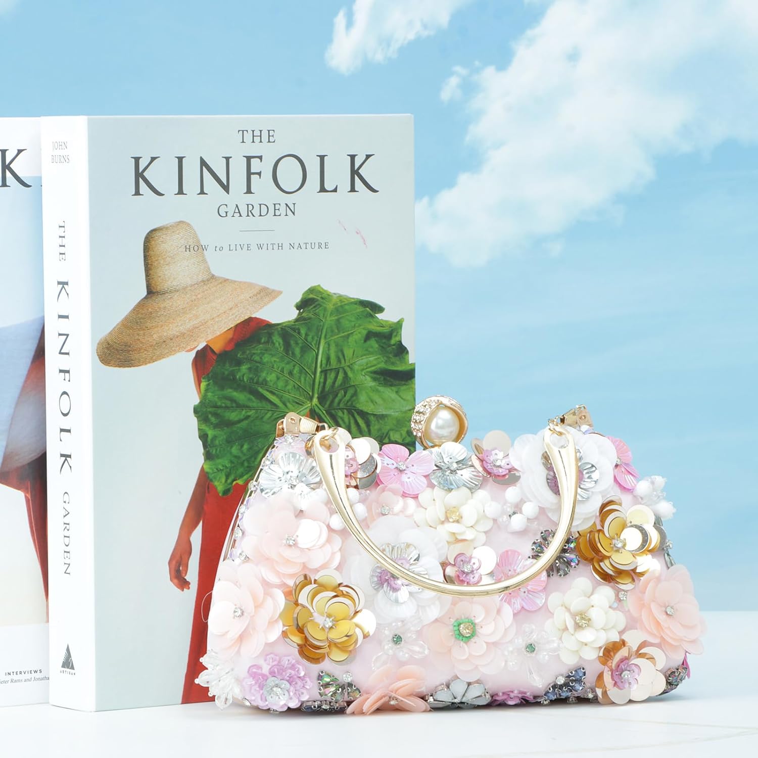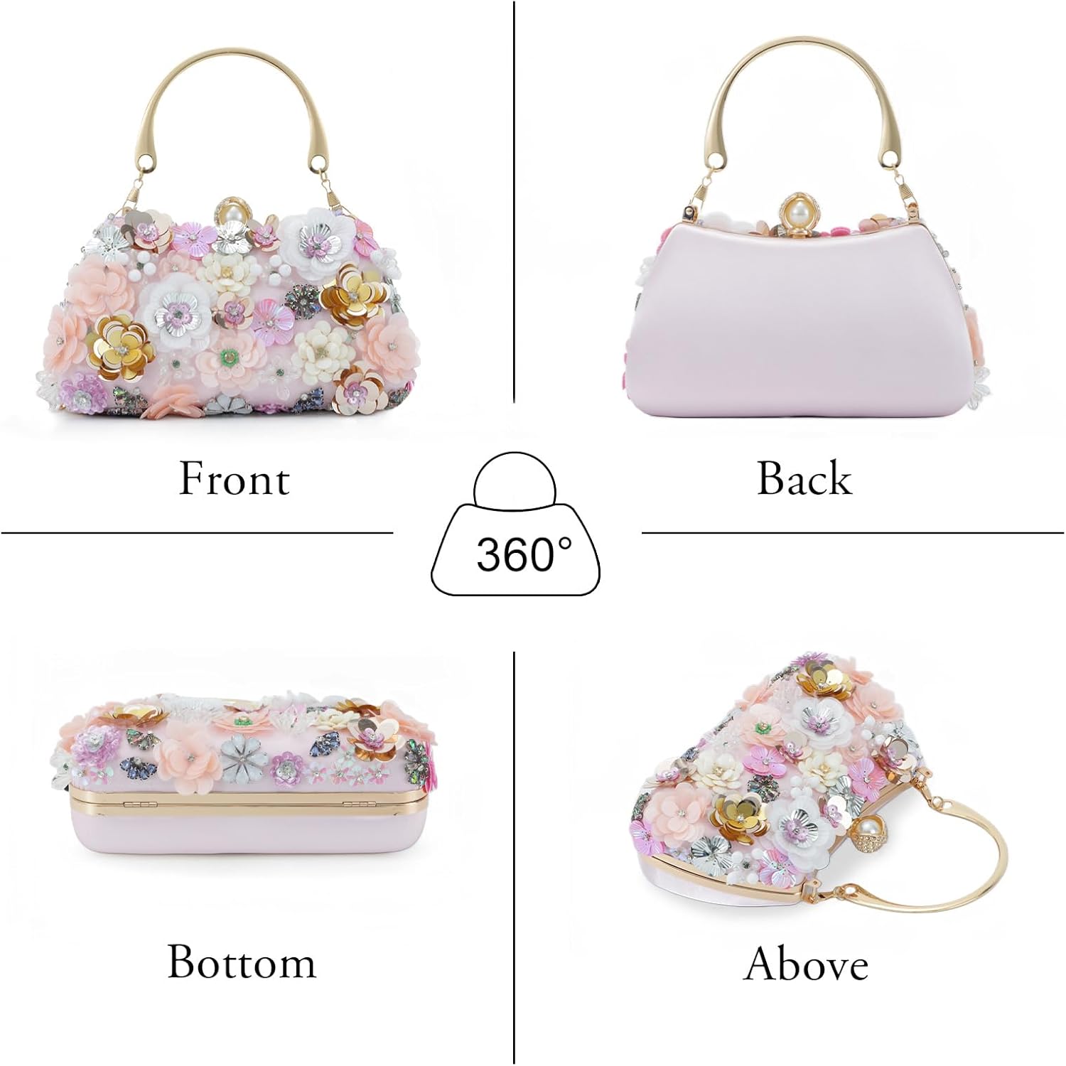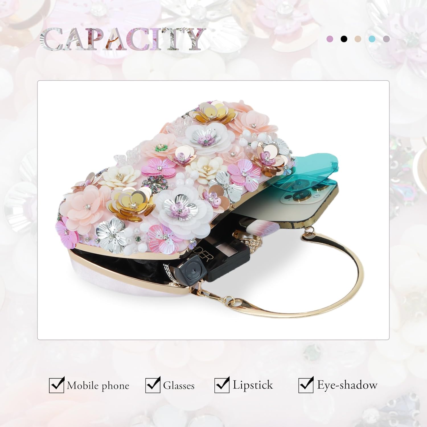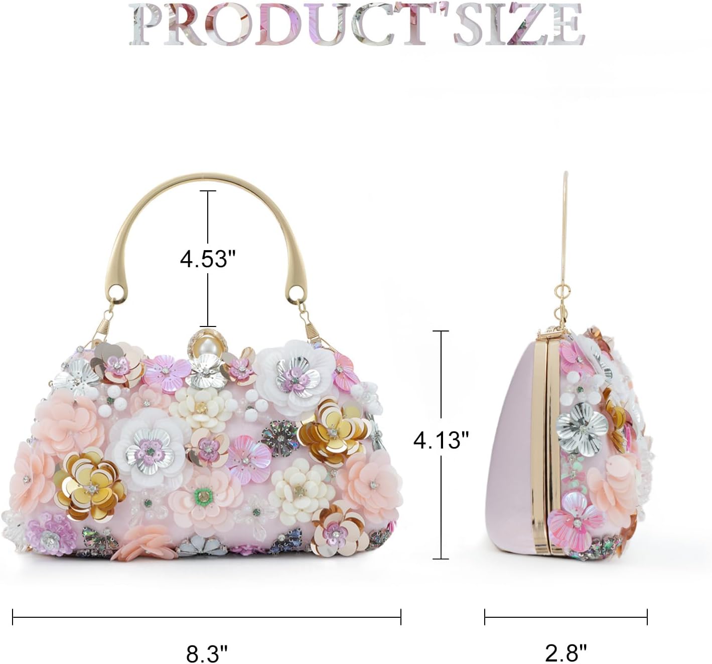 Material: The sequin handbag with a variety of materials: beads, flowers, sequins and crystals,are sewed on the clutch, which are not easy to fall off.