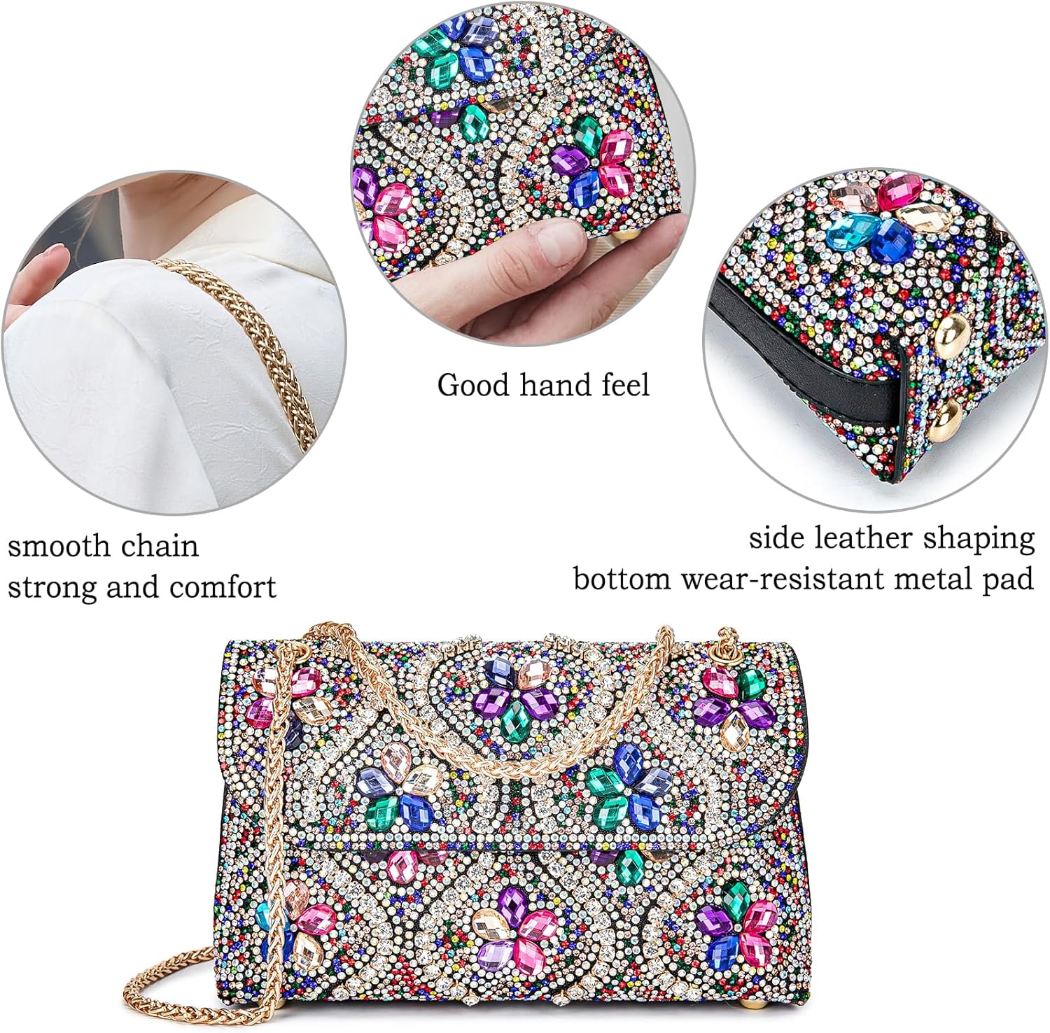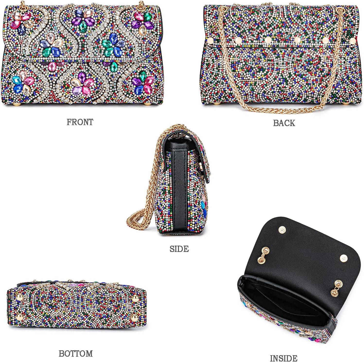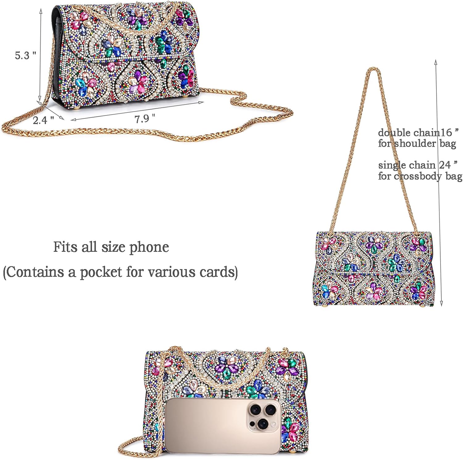Our BBTT.ful glitter evening clutch is full of dazzling rhinestones,exquisite floral design. Front flap with magnetic button closure, has a main compartment and a small card slot, with durable perforated double chains; BBTT.ful sparkly evening bags have the timeless appeal,which will match your clothing perfectly and make you charming at cocktail parties, proms, weddings, balls, club events, and evening outings. It also makes a thoughtful gift for special days like Valentine’s Day, Mother’s Day, birthdays, and Christmas.
