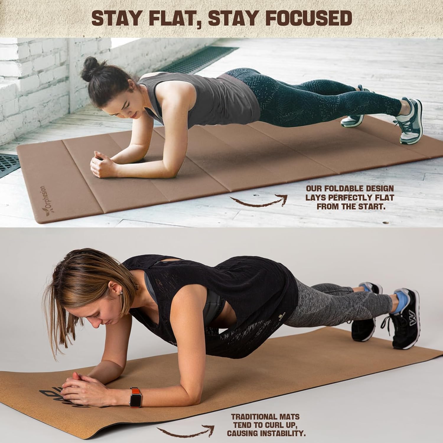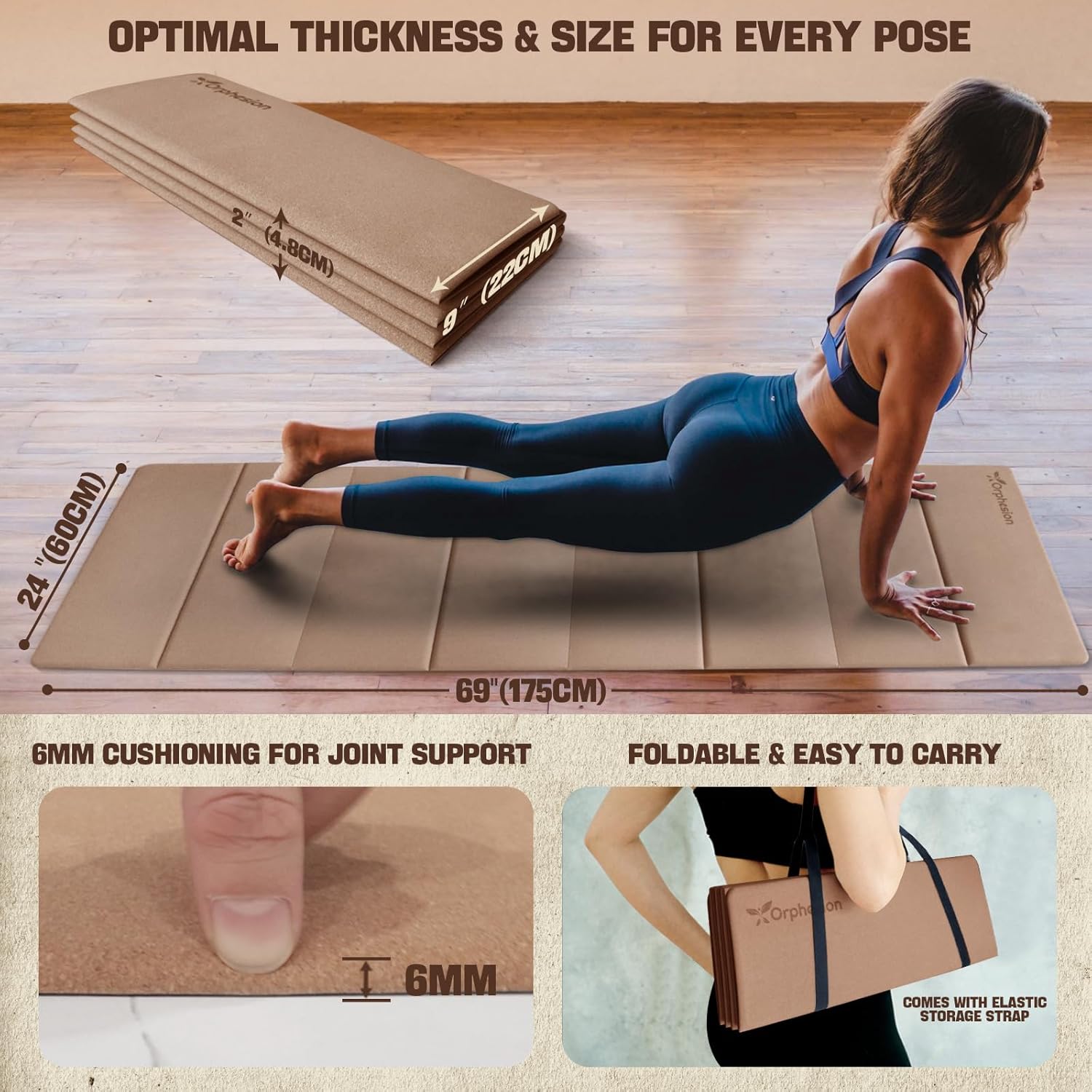 Foldable Cork Yoga Mat Lightweight Packable Travel Mat Non slip Folding Exercise Mat Natural Cork Resists Dirty and Odor Pilates Fitness Mat 0.24″(6mm) with Carrying Strap for Hot Yoga