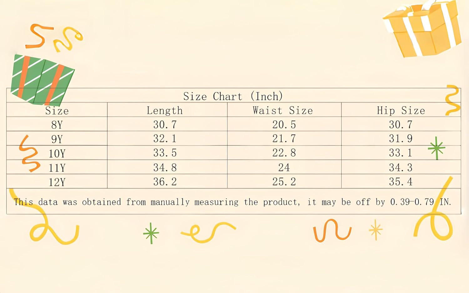 10 Years: Waist Size: 22.8″, Hip Size: 33.1″, Length: 33.5″