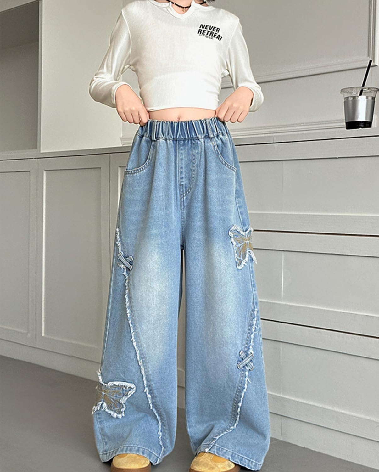Home Clothing & Fashion Jeans & Pants Girls Wide Leg Jeans Elastic Waist Baggy Butterfly Printed Jeans Y2k Aesthetic Loose Denim Pants 6-14 Years