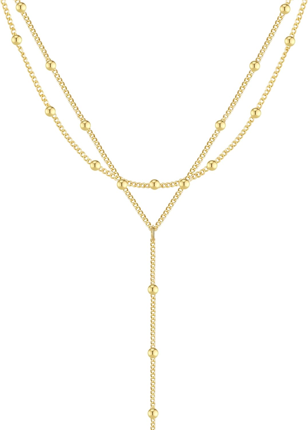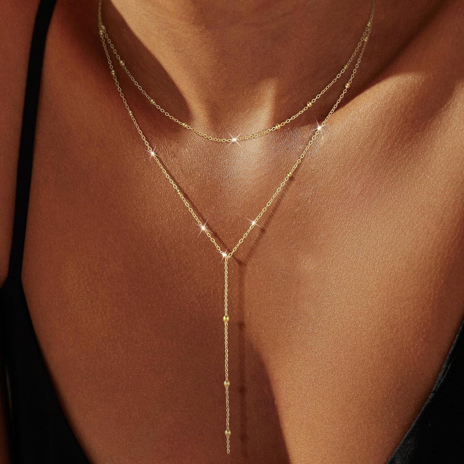 Gold Necklace for Women, Dainty Long Necklace 14k Gold Plated/Silver Y-Shaped Pendant Necklace Trendy Layered Cz Beaded Chain Lip chain Drop Necklaces for Women Gift Jewelry