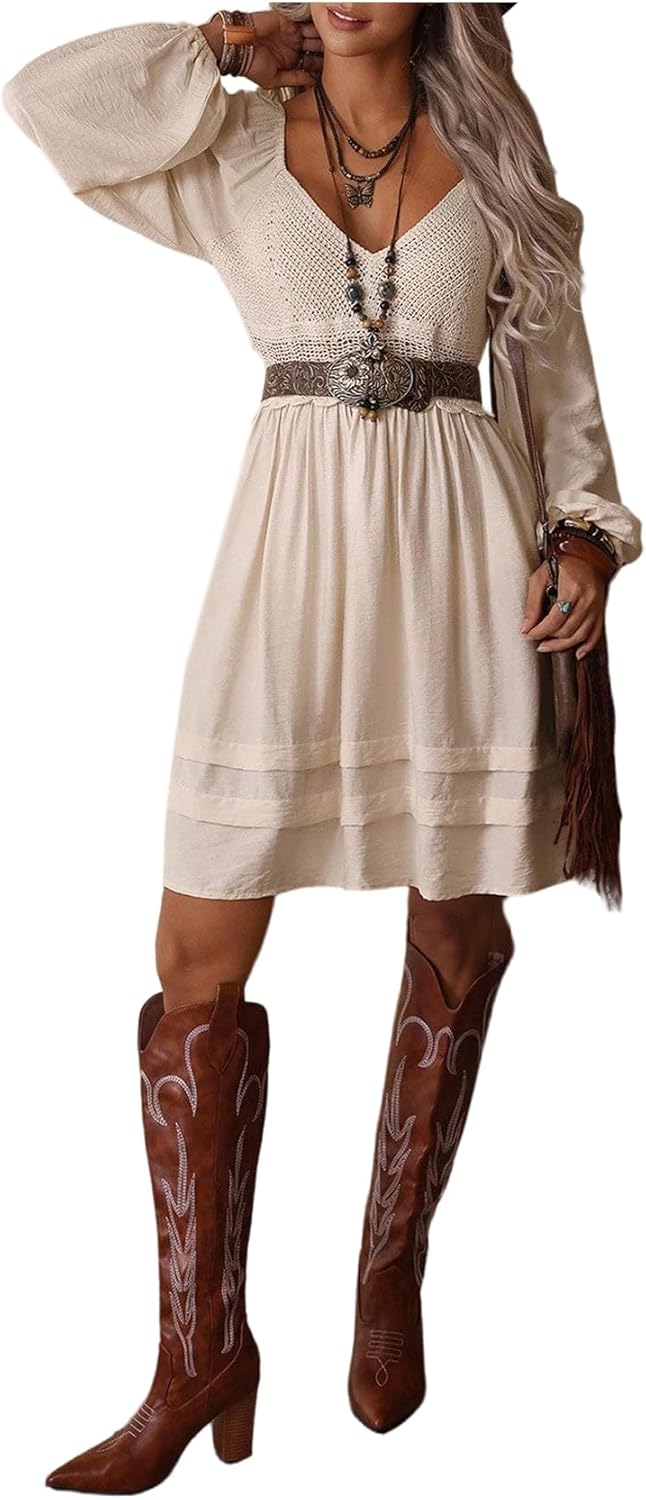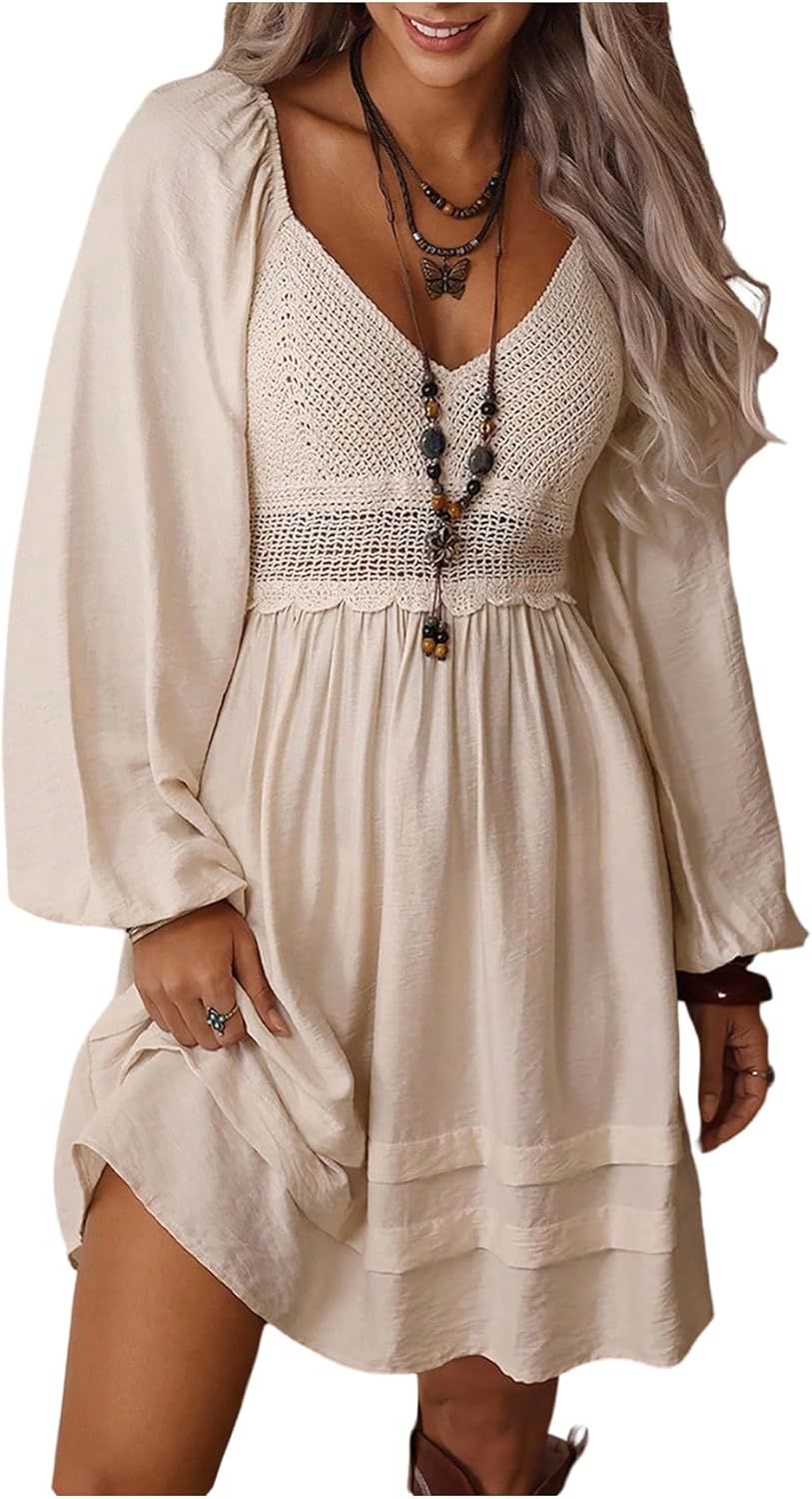 GORGLITTER Women’s Crochet Hollow Out V Neck Dress Puff Long Sleeve A Line Flowy Boho Short Dresses