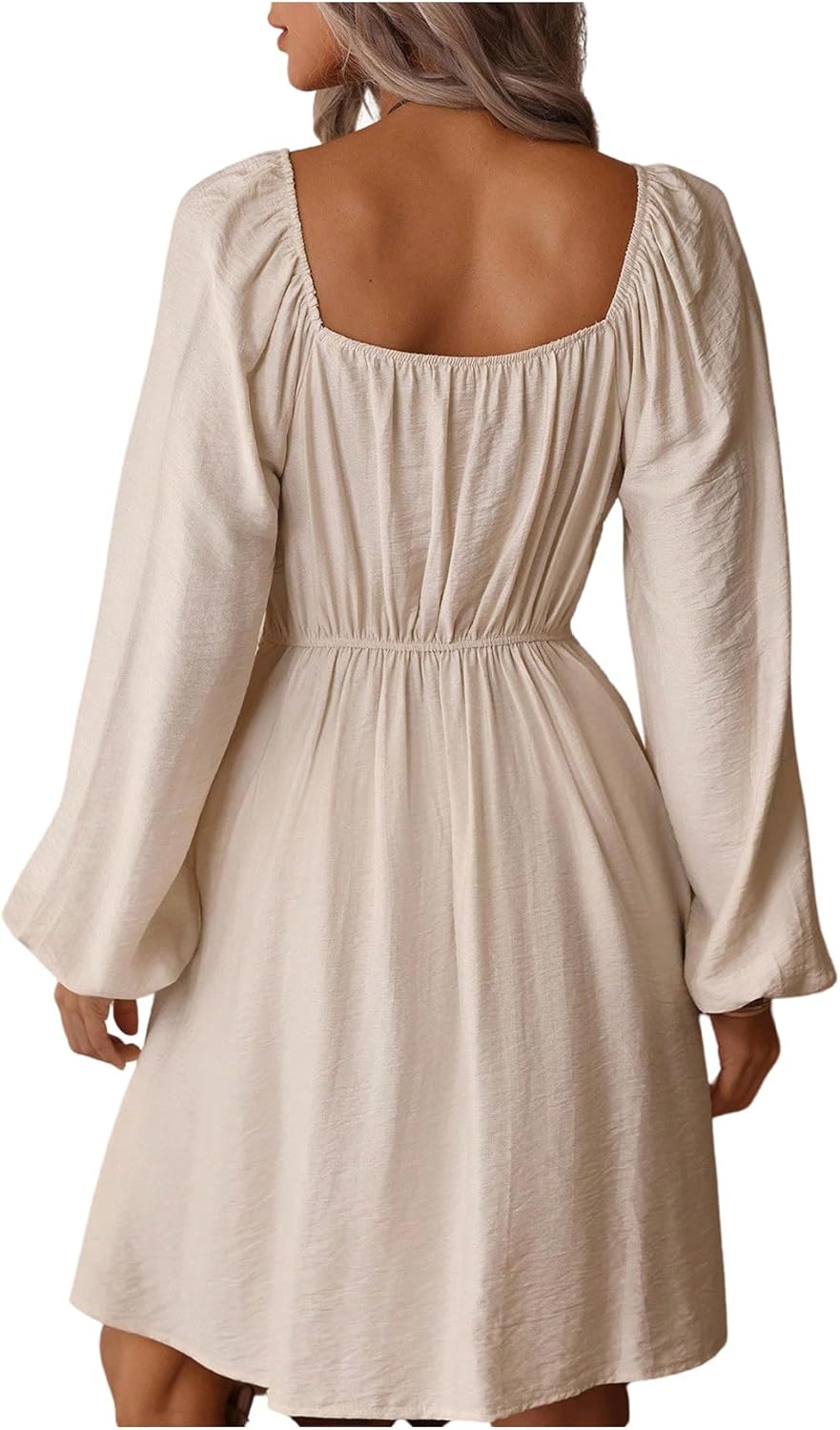 Dokotoo Womens 2025 Casual Dress Smocked Crewneck Button Up Long Sleeve Empire Waist A-Line Mini Dress