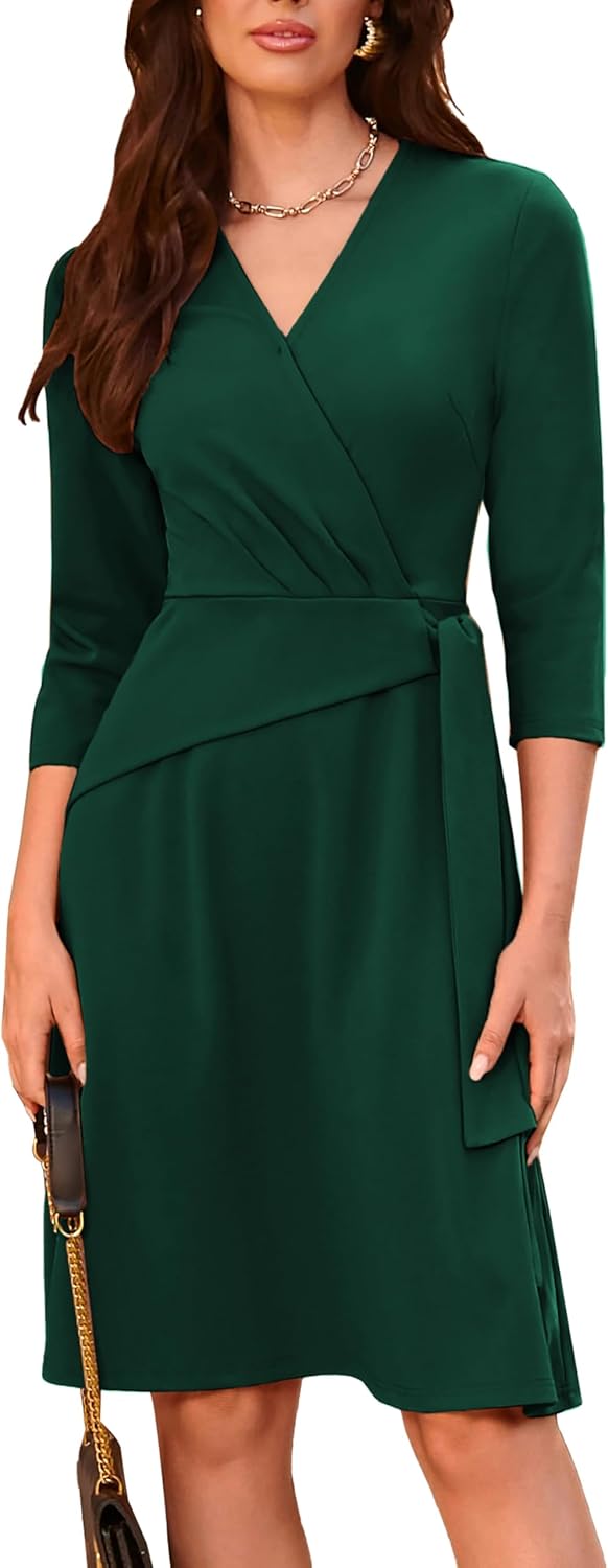 GRACE KARIN Womens Cocktail Dress Faux Wrap V Neck Pleated 3/4 Sleeve Stretchy Midi A Line Wedding Guest Dress