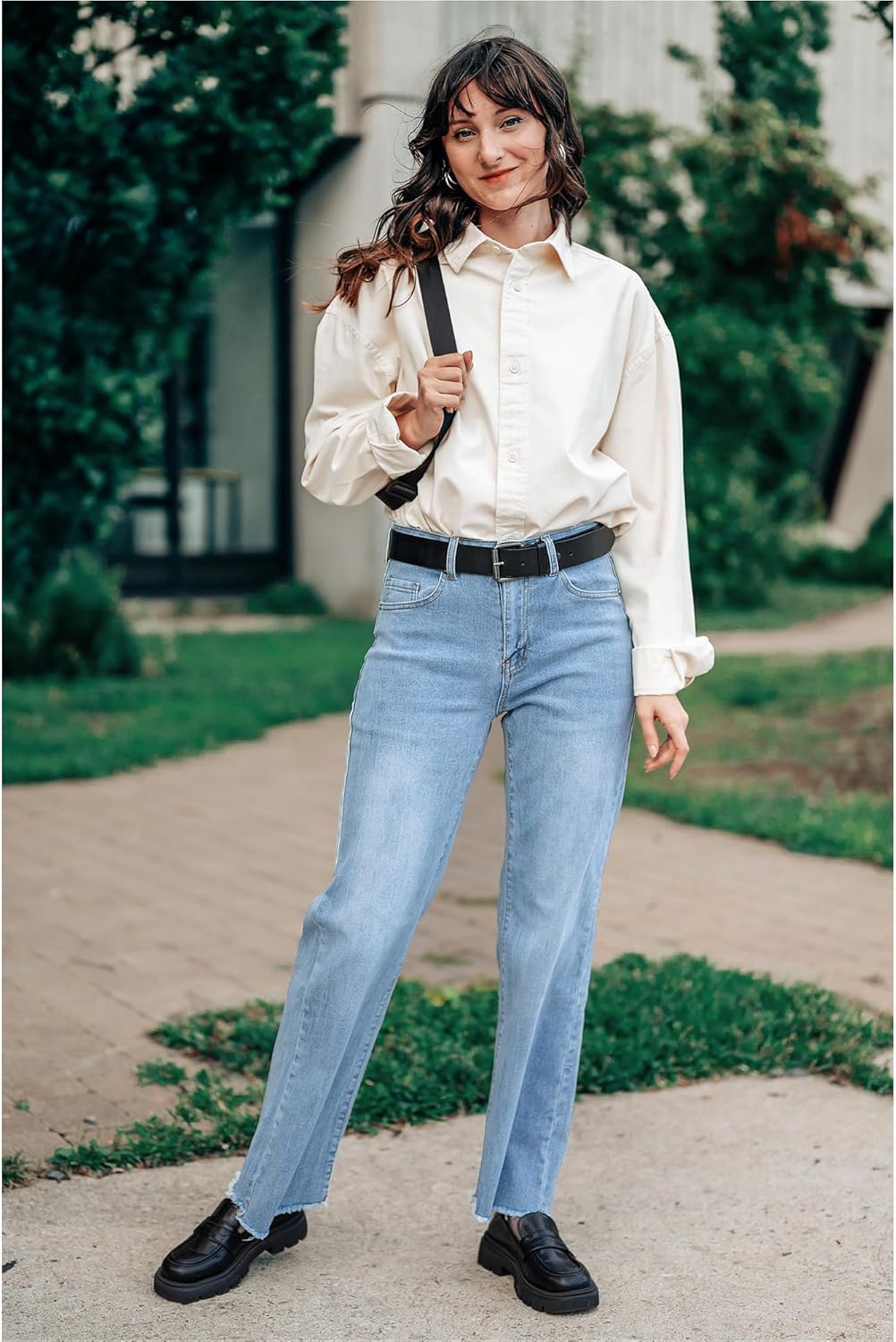 GRAPENT Straight Leg Jeans for Women High Waisted Stretchy Frayed Raw Hem Loose Denim Pants Casual Baggy Jean Trousers