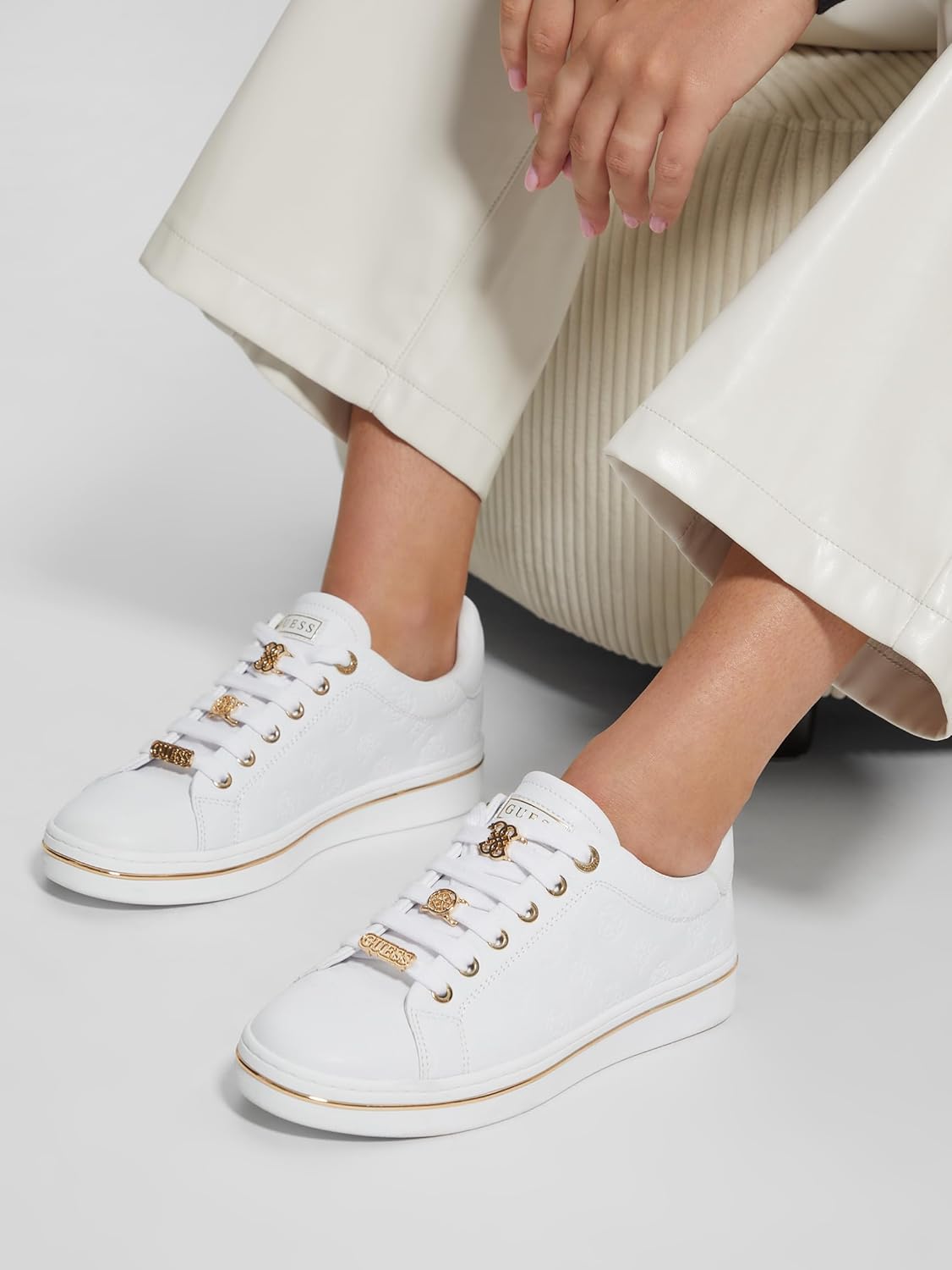This lace up look features GUESS charms on the laces and a gold metal rand in the outsole of this classic sneaker. This shoe is comfy, cool and ready to knock your socks off. Est. 1981, Guess is a global lifestyle brand and a symbol of a young, adventurous lifestyle.