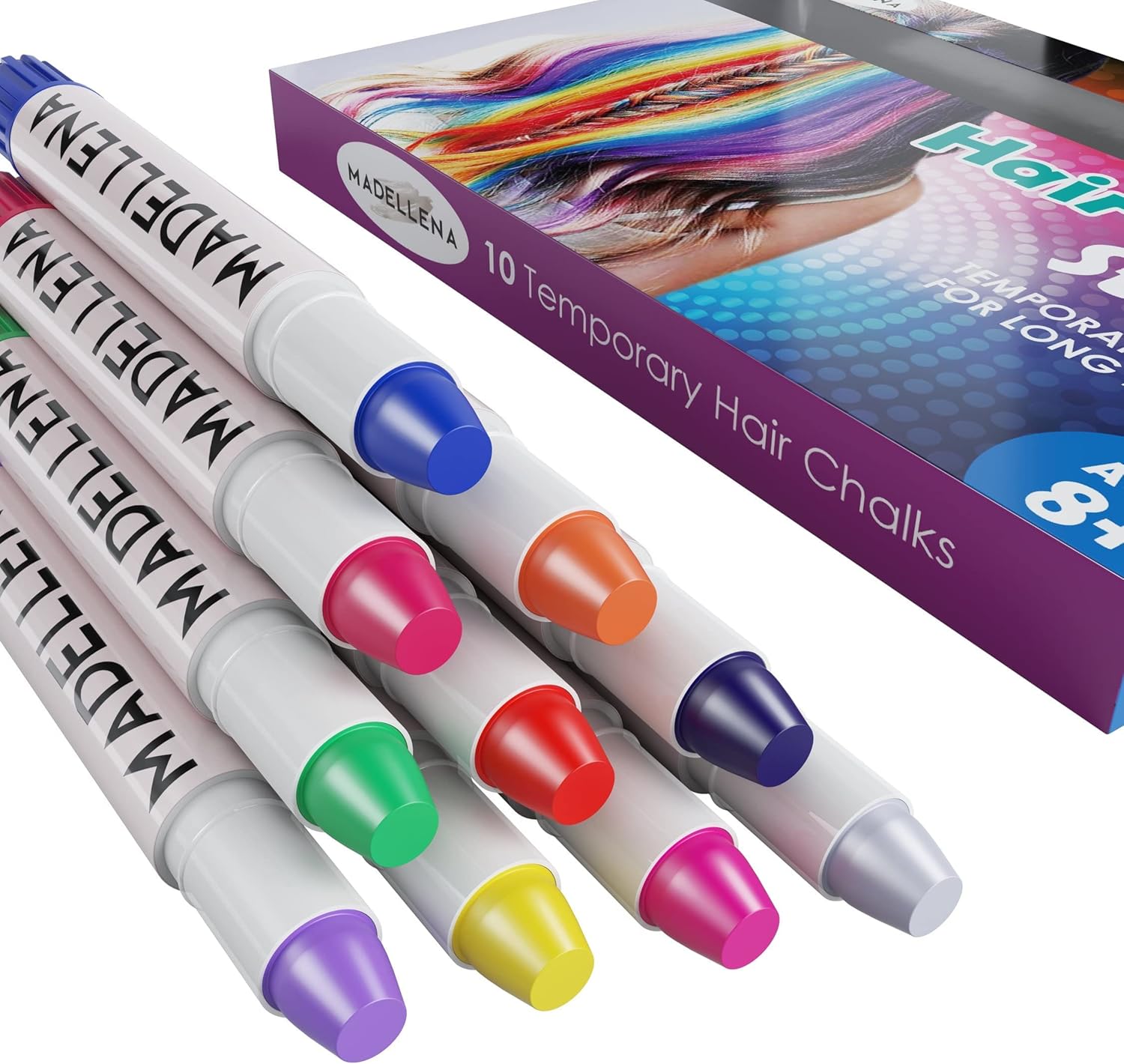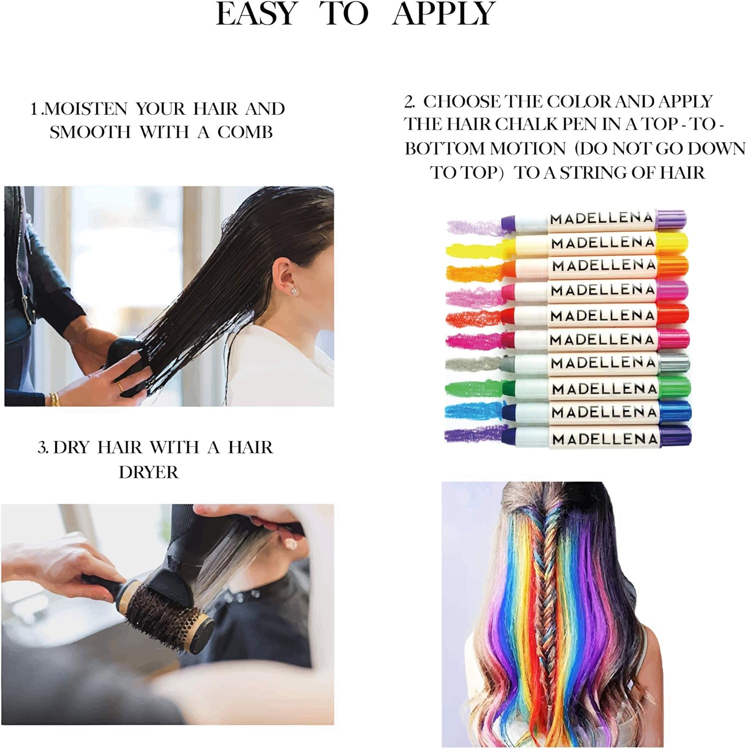 Madellena Hair Chalks are Non-Allergenic, Non-Toxic and Water-Soluble, Environmentally Friendly. Easy to Apply and Easy to Wash Off With Regular Water and Shampoo.