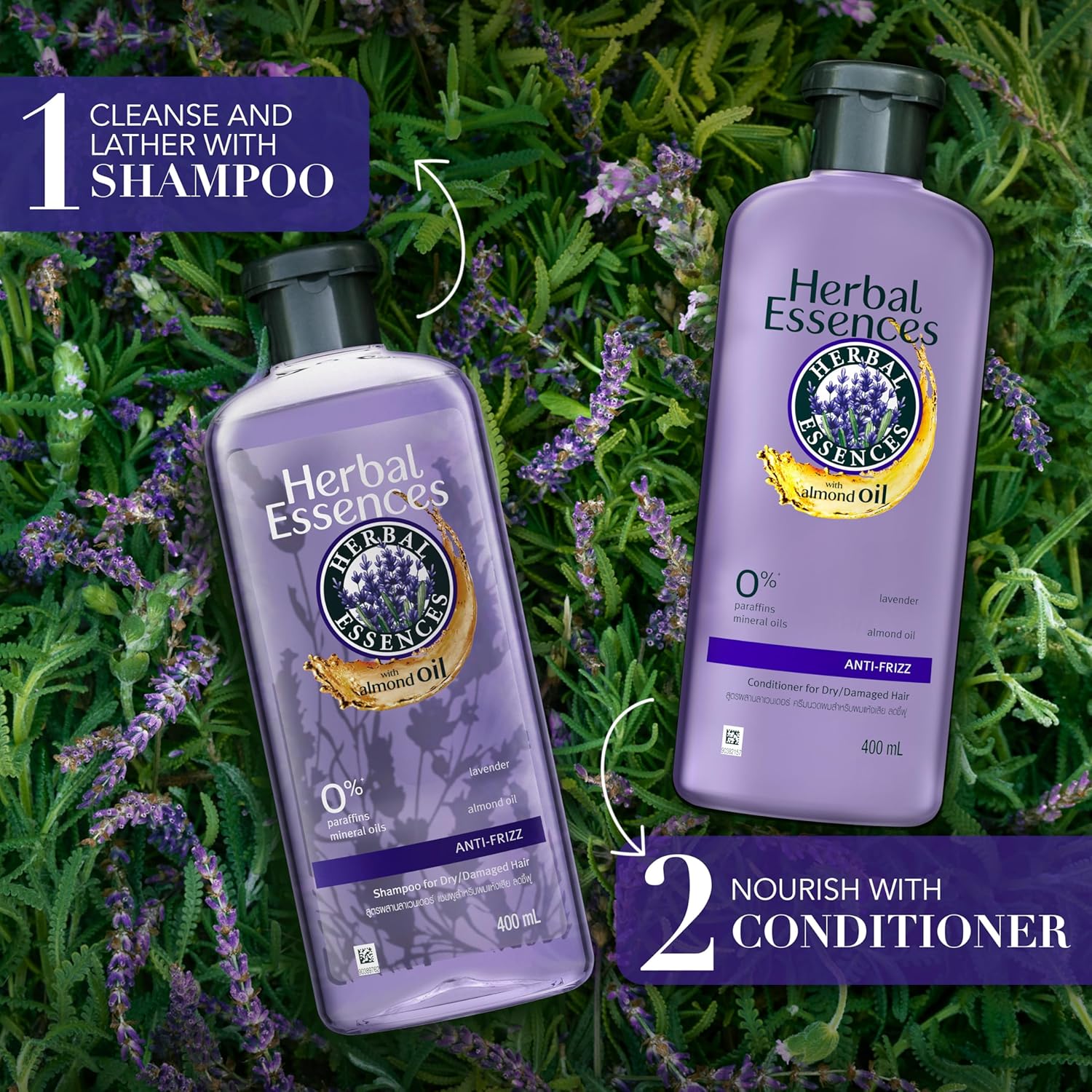 In search of a lavender-scented conditioner for frizzy hair? Uncap a bottle of Herbal Essences Classic Lavender & Almond Oil Anti-frizz Conditioner to revel in irresistible nature-inspired fragrances. Infused with lavender and almond oil, it controls frizz and leaves your hair straight and silky. WHY IT’S THE PERFECT HAIR CONDITIONER FOR YOU: • Formulated to control frizz and take care of dry, frizzy hair. • Discover the refreshing fragrance of lavender, citrus, and sandalwood. • Recognised by PETA as cruelty-free. • Packaged in a recyclable bottle OUR ‘FREE-FROM’ LIST • 0%^ mineral oils & paraffins WHY LAVENDER? Lavender is native to the Old World and is found in Cape Verde and the Canary islands. It is more than just an aromatic plant. This fragrant flower possesses health-beneficial properties. It is antimicrobial, soothes aggravated scalp, and nurtures hair strands. DIRECTIONS FOR USE: Apply conditioner generously to wet hair, leave on as desired and rinse thoroughly. OUR RECOMMENDATIONS Use together with Herbal Essences Anti Frizz Shampoo for the best results. ^Formulated without; except for carried over additives.