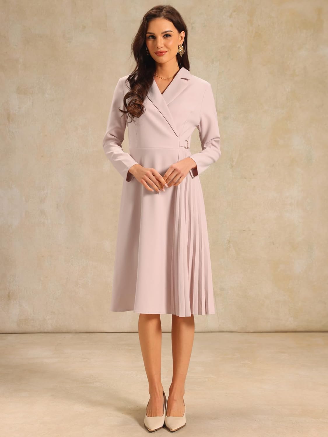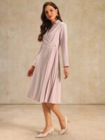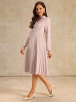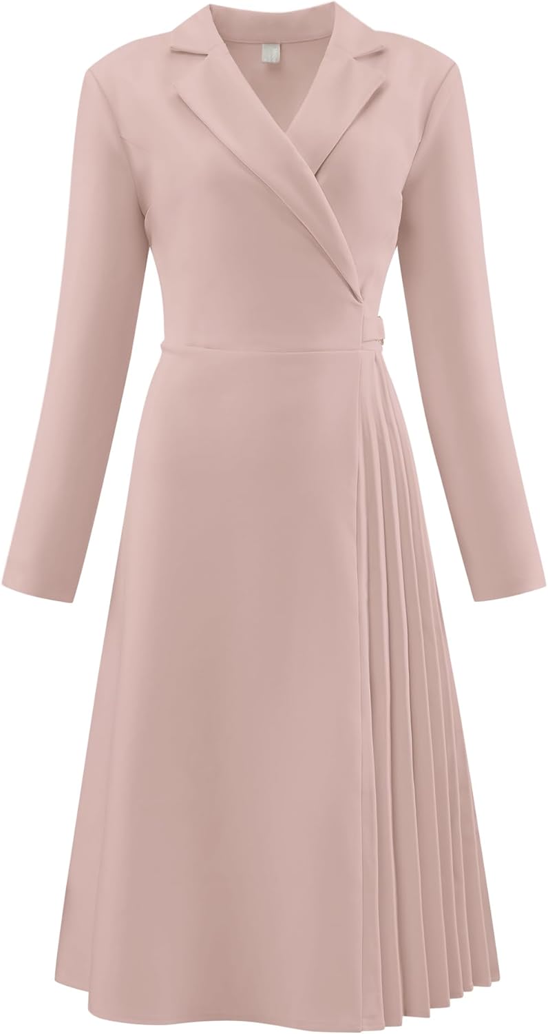 STYLE – Keep your look casual and elegant in winter weather with this pleated dress from Hobemty, featuring long sleeve, notch lapel, faux warp neck, A-line, no lined, midi length, pleated design.