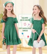 Elegant dress for girls combines timeless charm with playful details, featuring a delicate smocked waist for breathable comfort and a flattering silhouette. The stretchable panels in the girls ruffle dress allow a growth-friendly fit, adapting seamlessly to your child’s growth spurts. Off-shoulder sleeves and a retro-inspired square neckline add whimsical sophistication, while cascading double-layer ruffles create dynamic movement perfect for twirling.