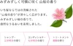 A fragrance that focuses on the moment the cherry blossoms open and awaited throughout Japan: A fresh, cute and sweet mountain cherry blossom scent. Shampoo [Triple Blooming Scent]> Conditioner [3/4 Blooming Scent] Treatment [Fragrance in Full Bloom] and the scent will bloom gradually