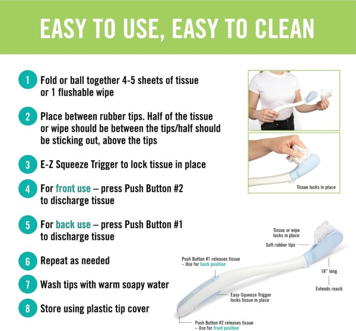 EASY SQUEEZE TRIGGER – locks toilet tissue or pre-moistened wipe in place between soft rubberized tips and easily releases soiled tissue by pushing button in one of two positions. Safe, comfortable, hygienic