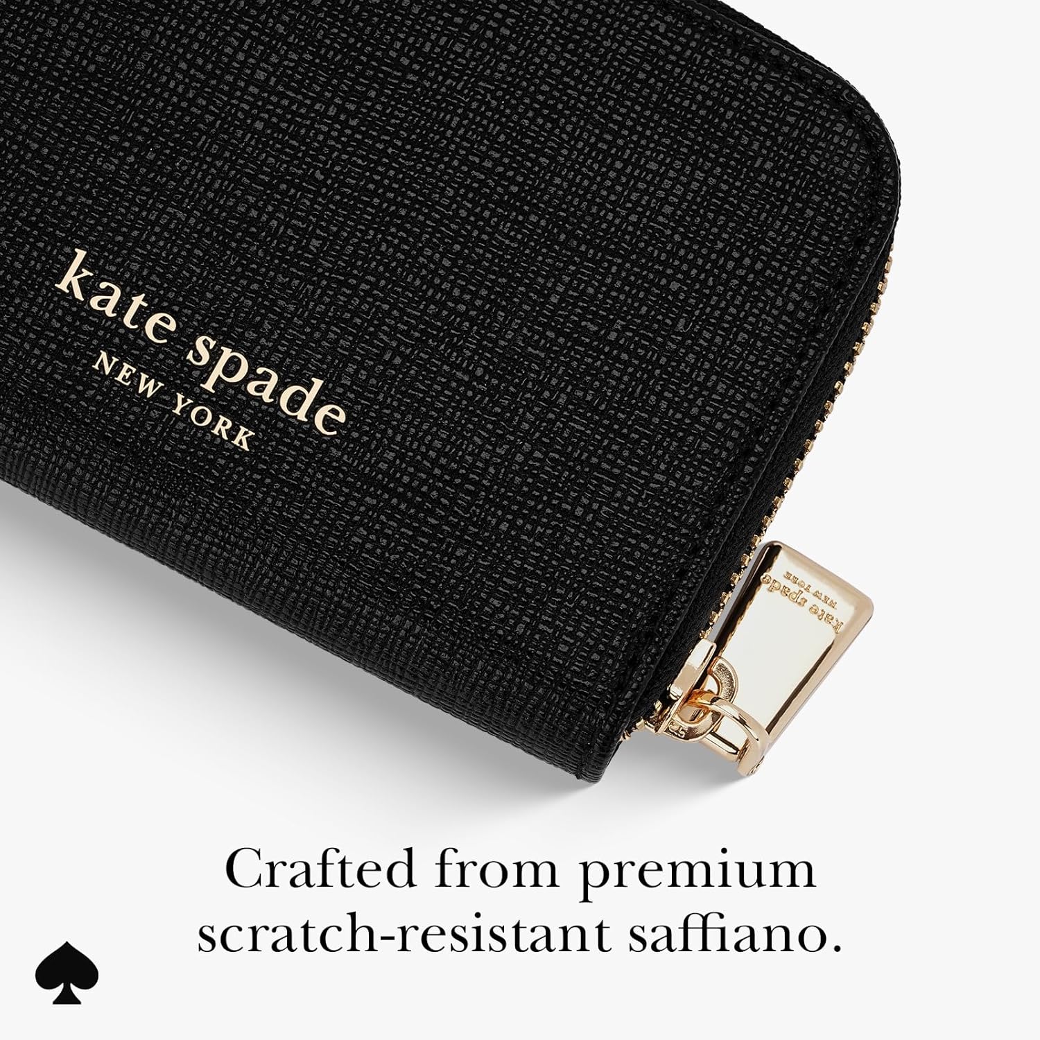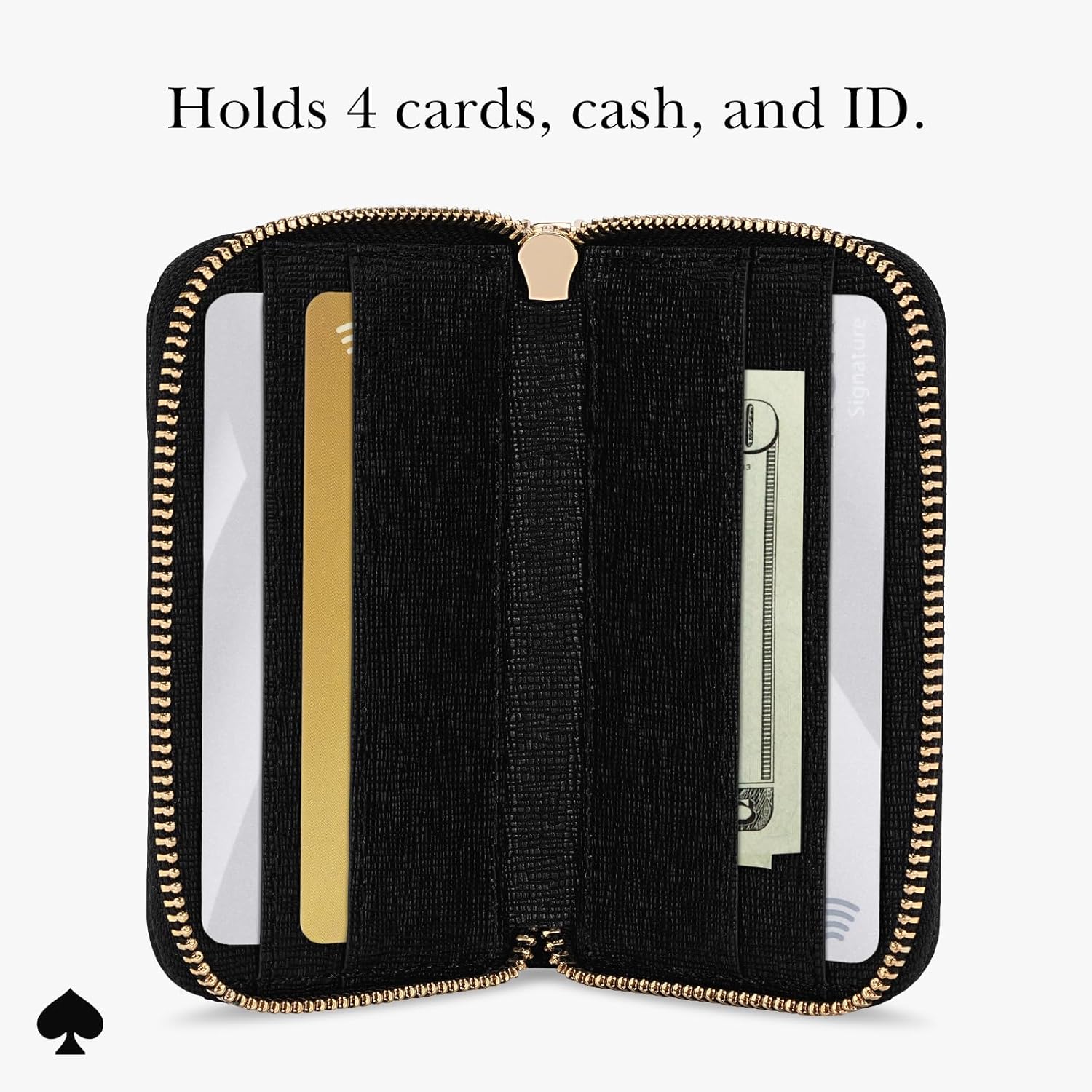 Premium Leather Design: Crafted from scratch-resistant Saffiano leather with gold-polished hardware, zipper, and the iconic kate spade new york logo, this card holder adds a touch of elegance to your everyday routine; It holds up to 4 cards and cash without compromising on durability or comfort