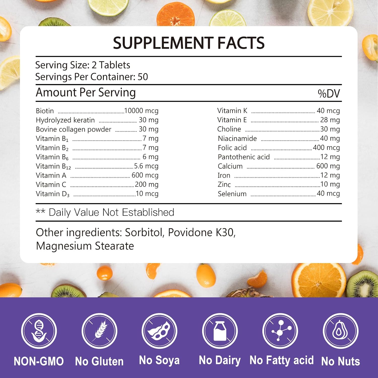 Biotin Supplement contains potent biotin, collagen, keratin and other essential nutrients to naturally support your health and beauty. Vitamin B1 Vitamin B2 Vitamin B6 Vitamin B12 Vitamin A Vitamin C Vitamin D Vitamin K Vitamin E Hydrolyzed keratin Bovine collagen powder Niacinamide Folic acid Pantothenic acid Calcium Iron Zinc Selenium