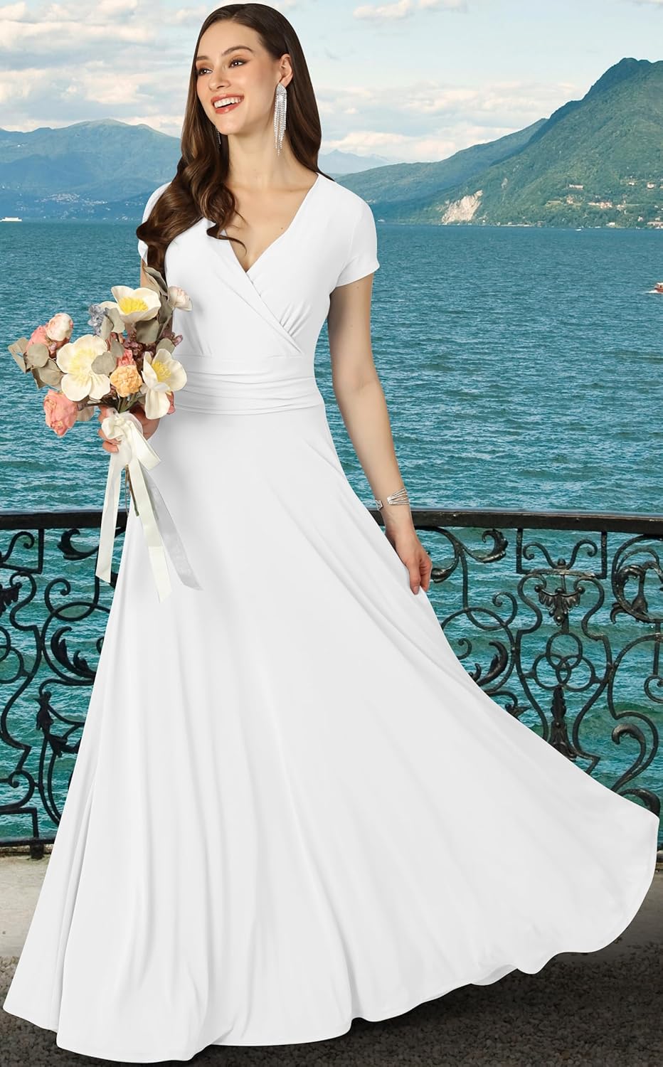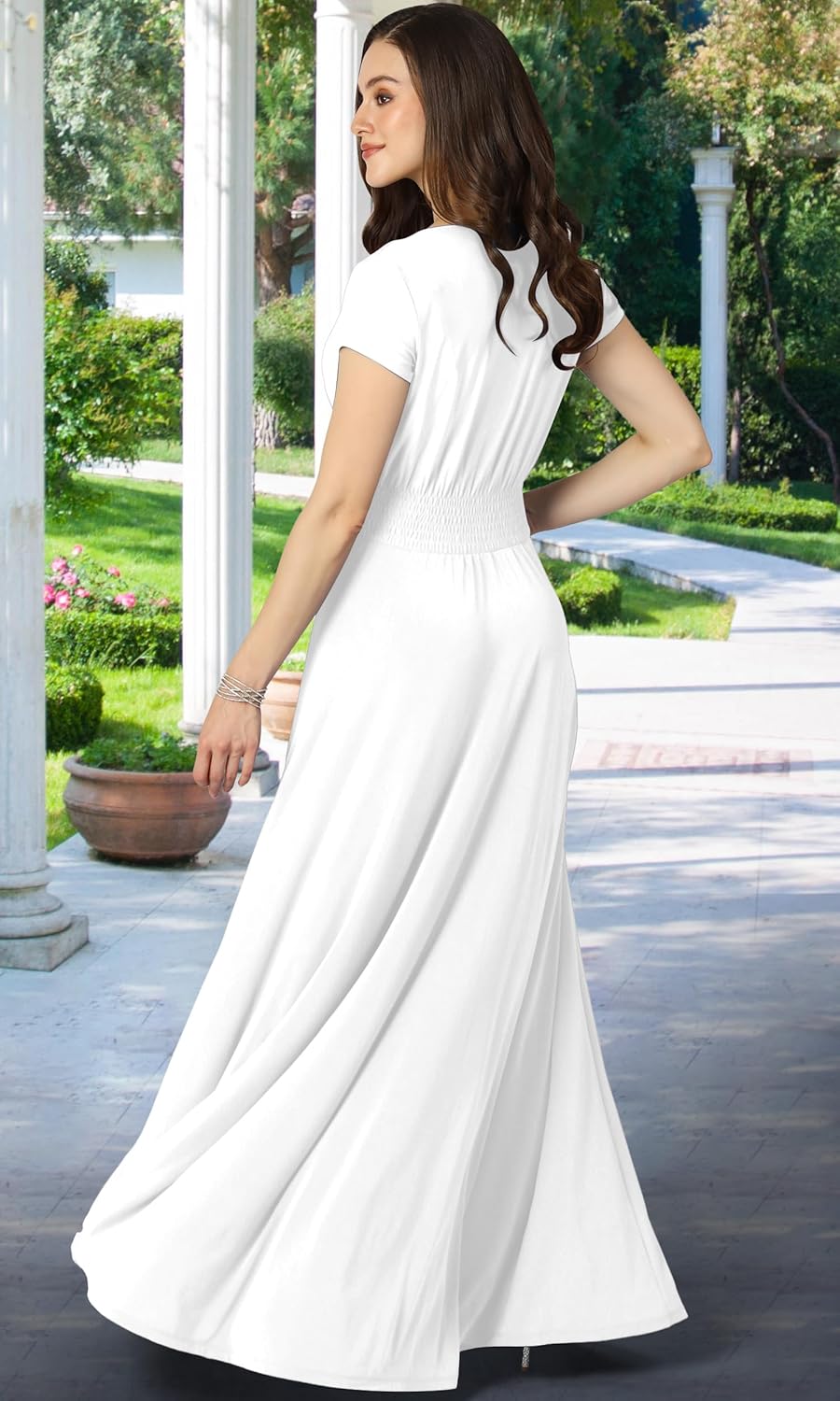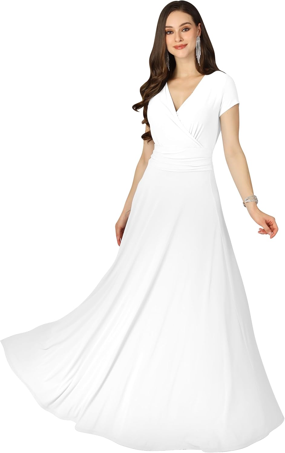 This is an absolutely elegant maxi dress with sleeves from Koh Koh. This design features short cap sleeves and the chest crossover neckline. The dress comes with an elastic mid-waist and a generous empire waist, giving the dress a lovely flowing skirt. This design is very popular with weddings as a bridesmaid dress, mother of the bride or mother of the groom dress and also some customers have used the white or ivory color as an understated wedding dress.