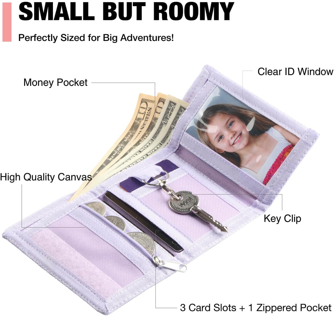 Spacious and Organized: Experience exceptional organization with our kids wallet. It features a generous 1 ID window, 1 secure zipper purse, 3 dedicated card pockets, and 1 substantial cash pocket for all their essentials.