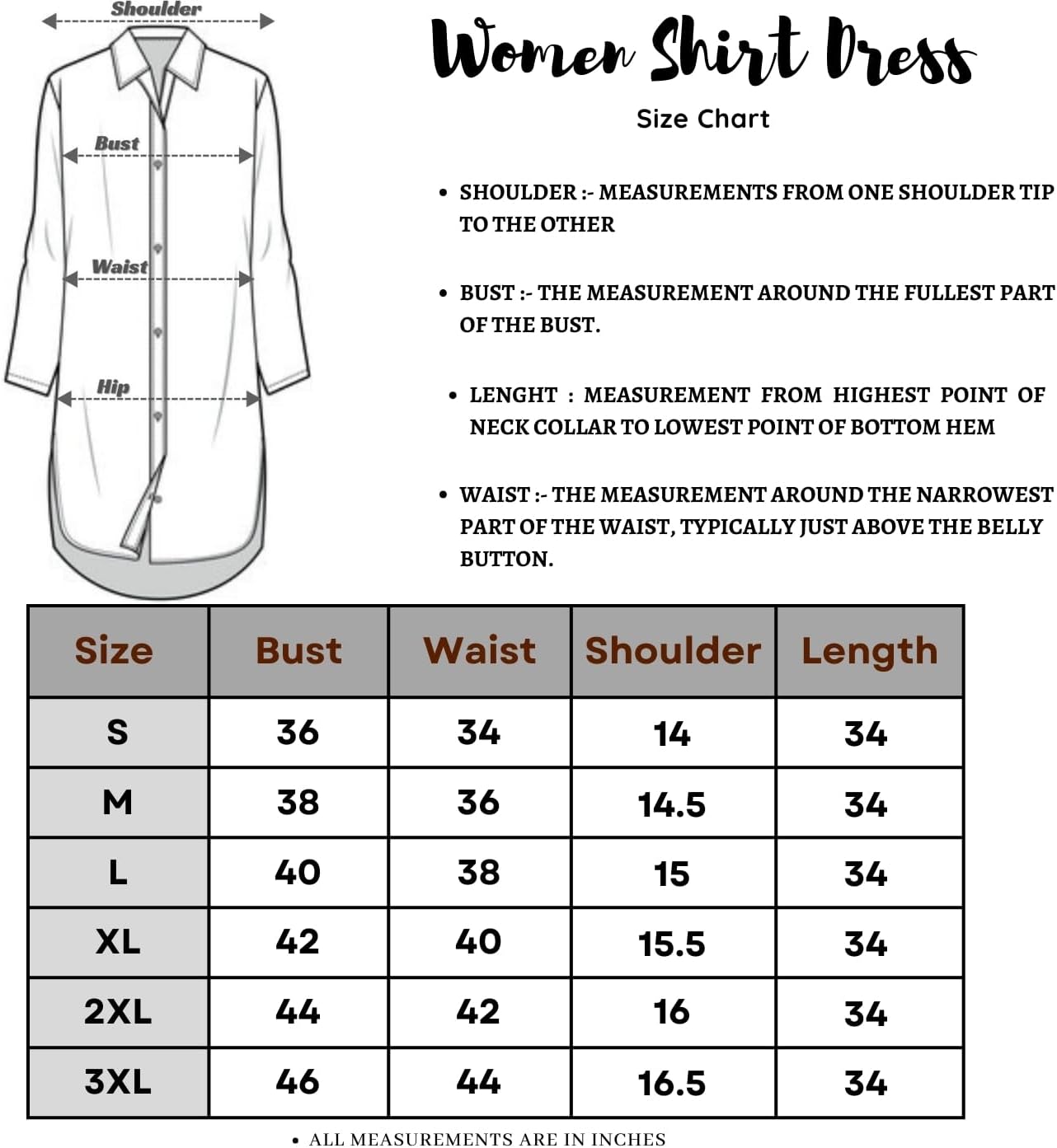 Leriya Fashion is the ultimate destination for occasionwear, offering hand-embellished designs and feminine details in luxurious fabrics. Introducing our elegant and versatile Rayon Solid Button Front Shirt Dress with Roll Tab Sleeve & Collared Neck Flared for Women. This dress combines classic style with modern comfort, making it a must-have addition to your wardrobe. Crafted from Best-quality rayon fabric, this dress offers a soft and lightweight feel, ensuring all-day comfort. The solid color adds a touch of sophistication and versatility, making it easy to dress up or down for various occasions. The button front design adds a polished look to the dress, while the collared neck enhances its chic appeal. The flared silhouette creates a flattering fit that accentuates your curves and allows for easy movement. One of the standout features of this dress is the roll tab sleeves, which offer flexibility in styling. You can effortlessly switch between long sleeves and three-quarter sleeves, adapting to changing weather or personal preference. This shirt dress is perfect for both casual and semi-formal occasions. Pair it with sandals or sneakers for a relaxed daytime look, or dress it up with heels and accessories for a more sophisticated ensemble. Whether you’re heading to the office, on a brunch date, or at a social gathering, this dress is a versatile choice. Revamp your wardrobe with this stylish and comfortable shirt dress, and elevate your fashion game. Please refer to the size chart to find your perfect fit.