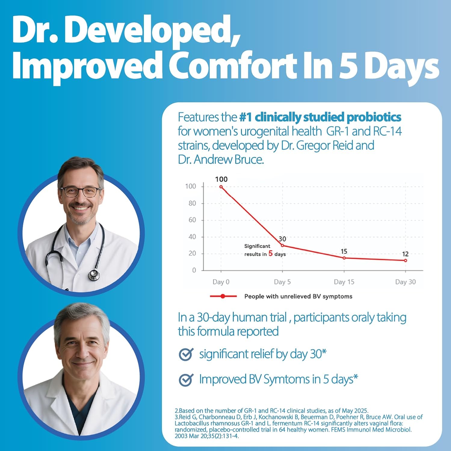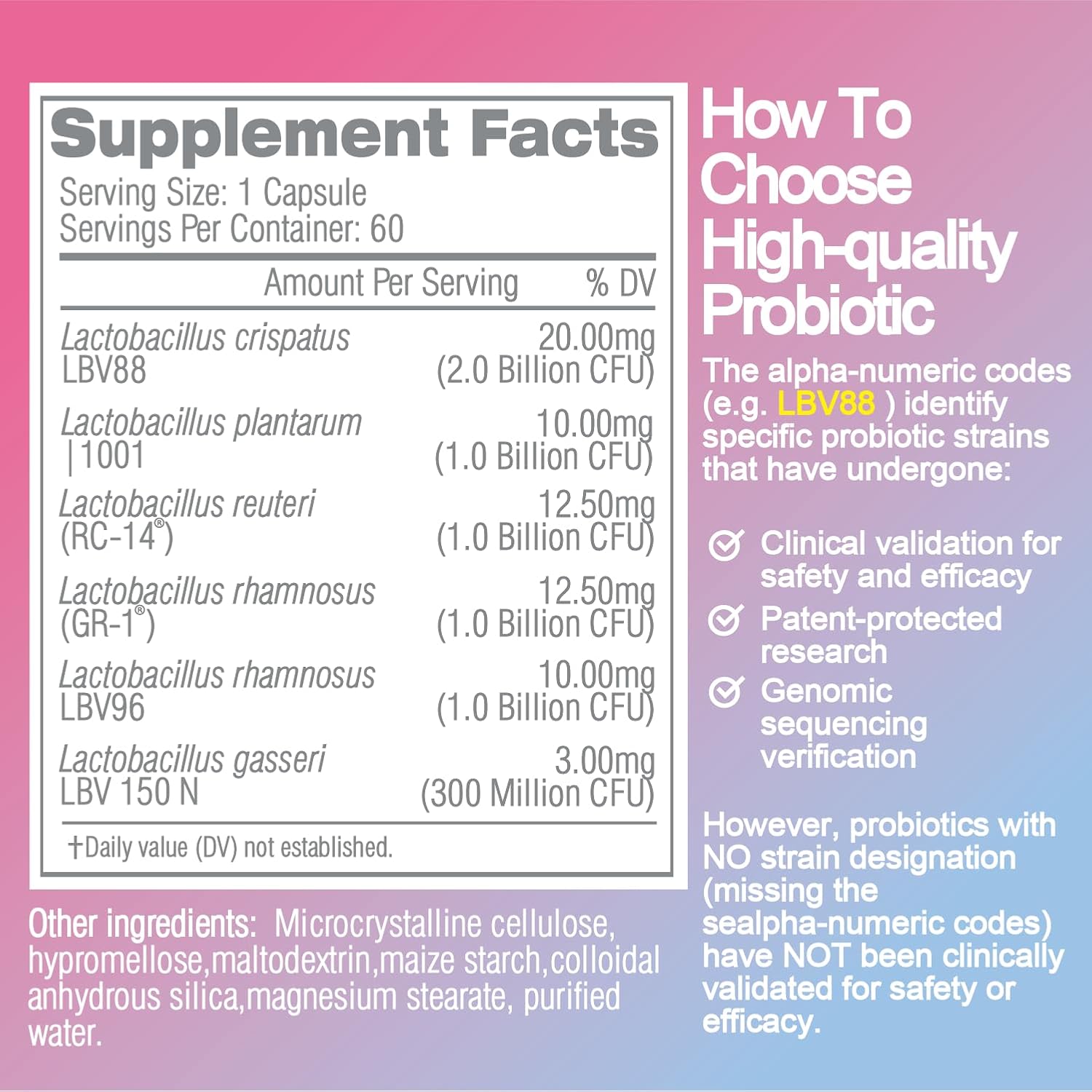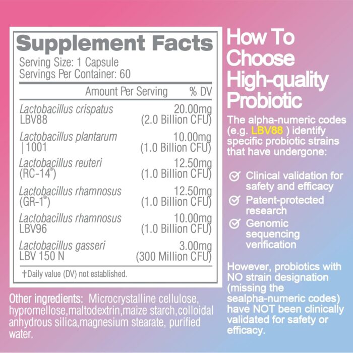 A premium, targeted probiotic formula containing 6 strains of beneficial bacteria. It includes Lactobacillus crispatus, which is commonly found in a healthy vaginal microbiome.