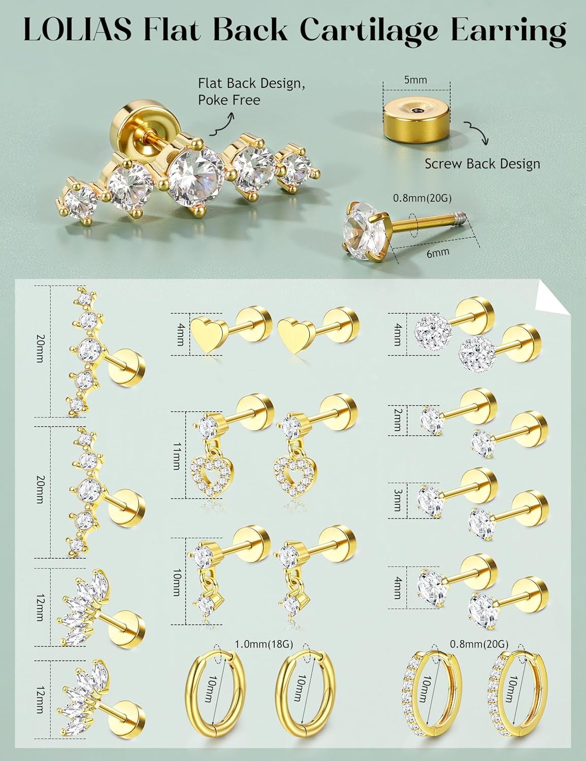 Title:LOLIAS Hypoallergenic Flat Back Earrings for Women Cartilage Earrings Stacks-20G Surgical Stainless Steel Flatback Stud Hoop Earring Set Daith Conch Tragus Helix Piercing Jewelry
