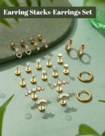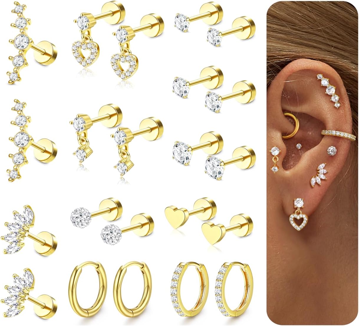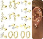 Stud Hoop Earring Sets for Multiple Piercing Jewelry:Lobe stud earrings,long cartilage earring flat back,,dangle helix earrings,stud tragus piercing jewelry,flat back conch daith rook earrings piercings.Hypoallergenic gold hoop cartilage earring sets for multiple piercing,the second hole,the third hole,,well fitted and stackable