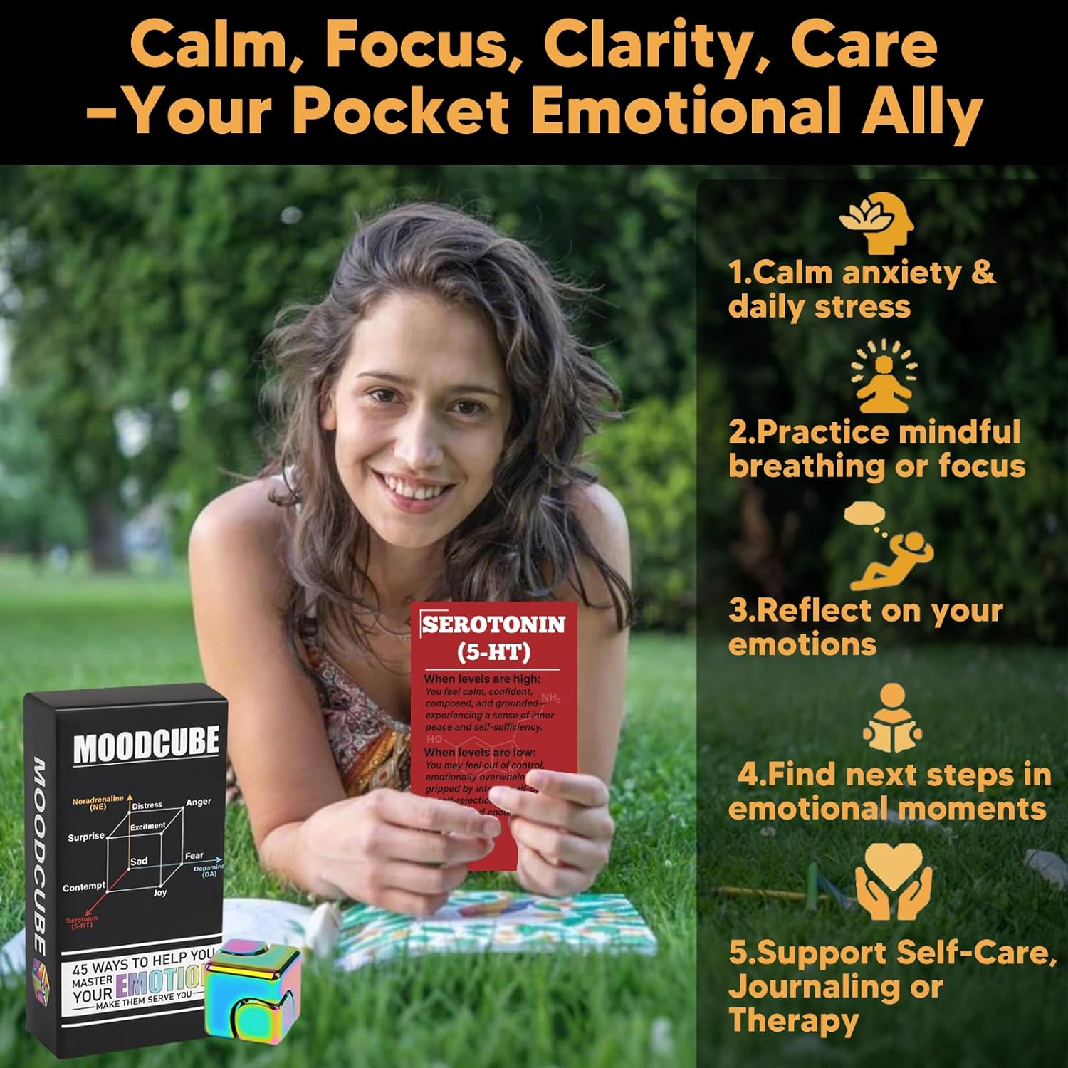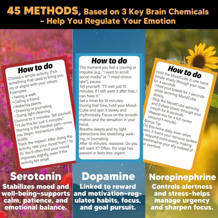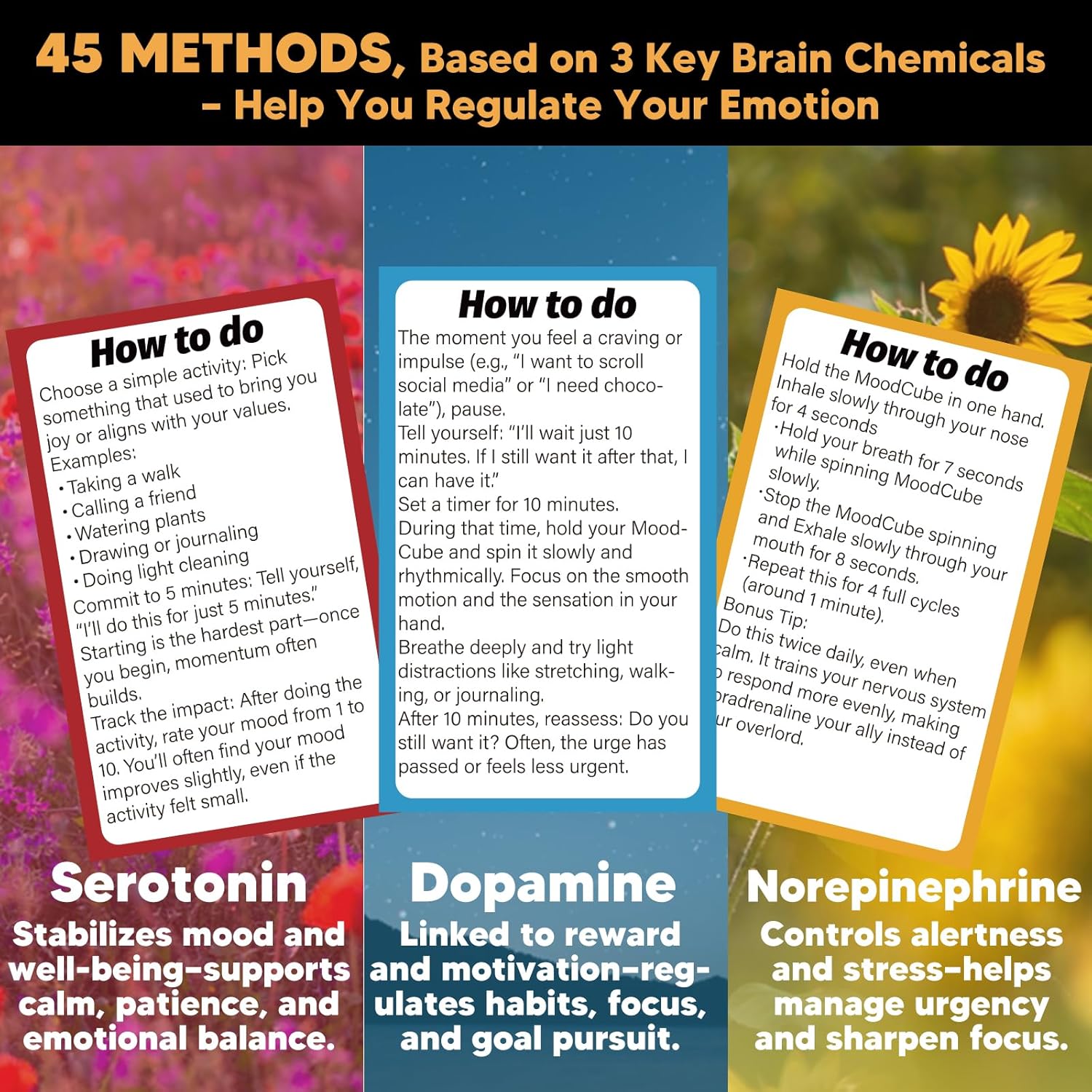Turn Emotional Overwhelm into Manageable Actions: Our neuroscience-based card set, built on dopamine, norepinephrine, and serotonin, Break down emotional distress into science-based explanations and coping strategies to help you reshape your emotions. Paired with the fidget cube-inspired MoodCube for instant sensory relief, it’s a perfect anxiety coping kit. By offering stress relief cards and grounding techniques for anxiety to bring calm and clarity anytime, anywhere
