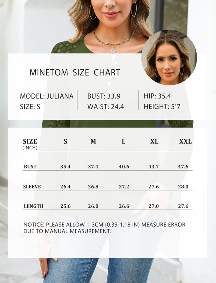 Minetom Women’s Lace Long Sleeve Tops Henley Shirts Button Down Casual Blouses Fall Clothes 【SOFT MATERIAL】Polyester, Rayon and Spandex; Soft, stretchy, breathable and smooth fabric; It’s comfy to wear it all day.
