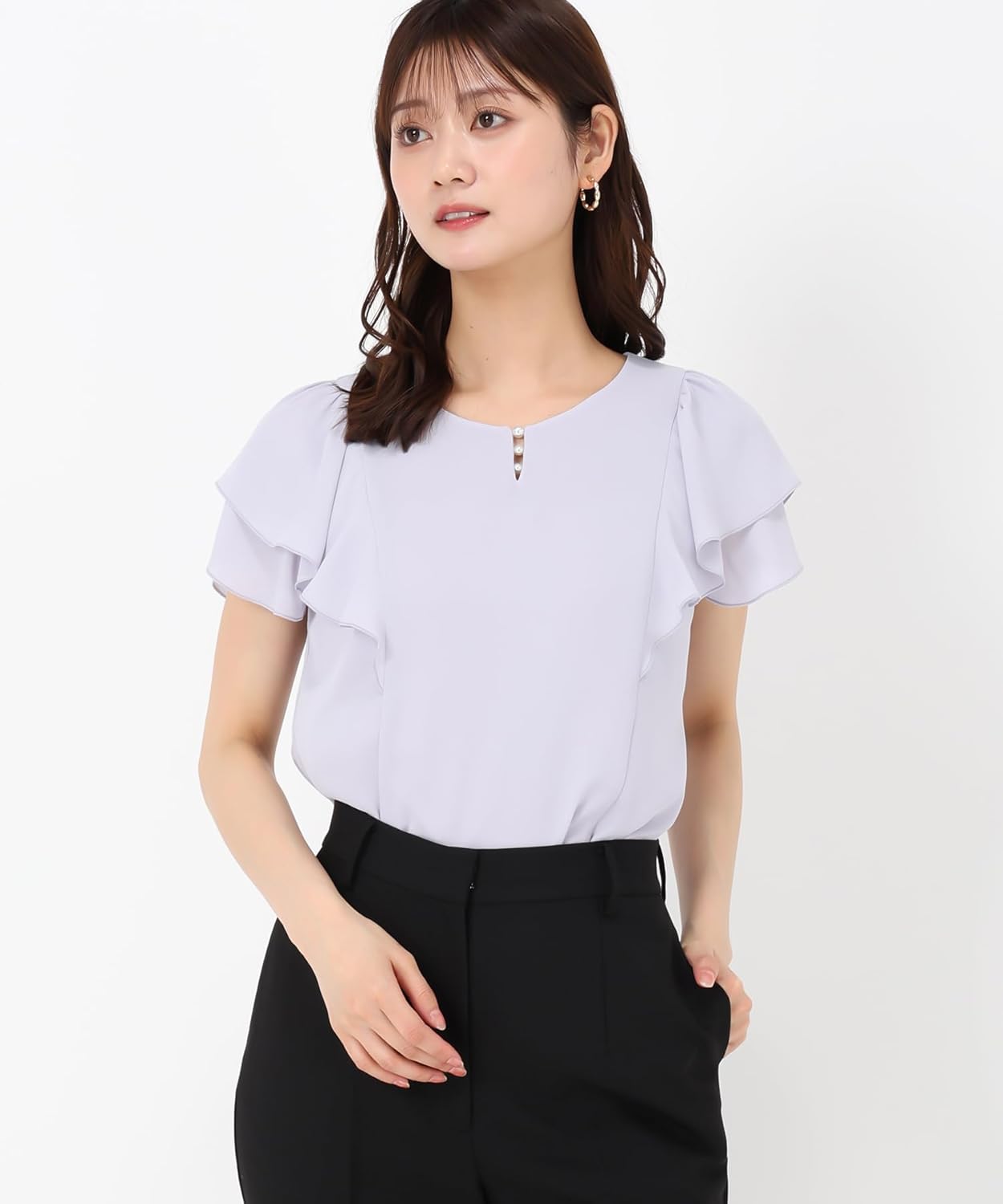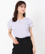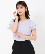 A blouse with a pearl at the neck for a subtle accent. Fluffy ruffled sleeves create a soft texture. Roomy neckline. It is an item that accentuates your femininity just by adding it to your outfit.