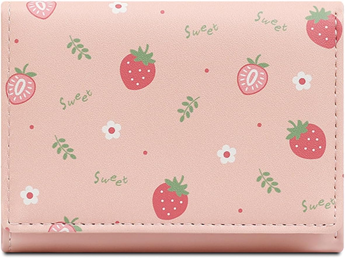 MOZXIRZ Women Girls Wallet Cute Strawberry Wallet Small Tri-Fold PU Leather Wallets Women Purse Short Trifold Wallets Cash Card Holder Bag, Pink