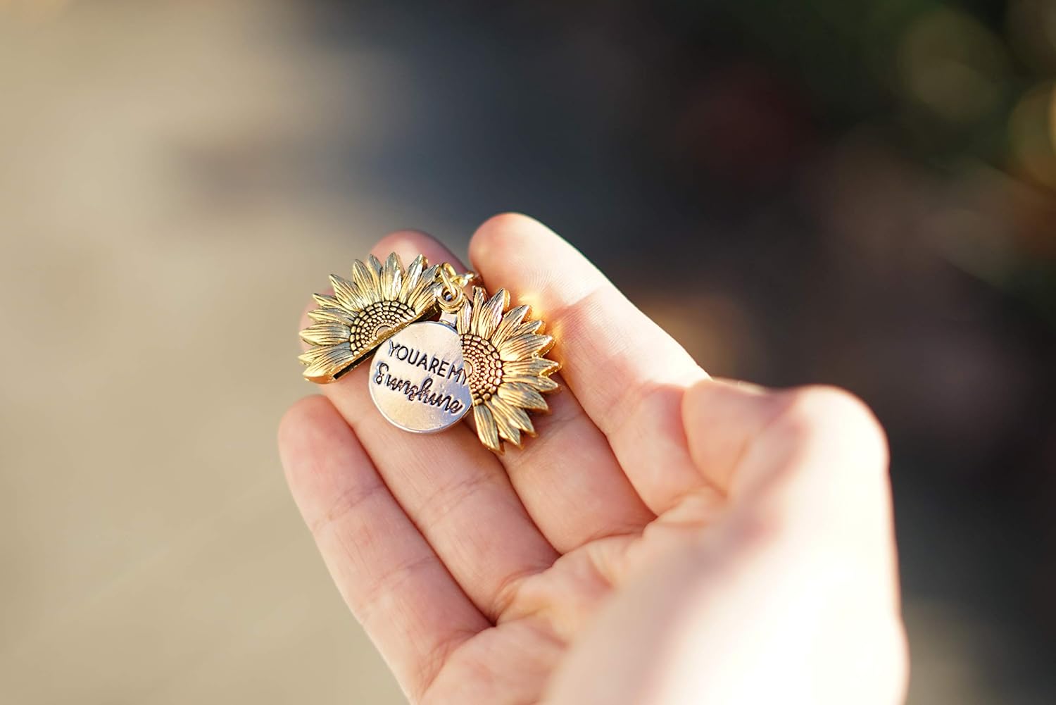 MyLittleSunflower – You are My Sunshine Necklace – Sunflower Necklace Locket with Engraved Hidden Message Pendant for Women, Mother, daughter Show your loved ones how much they mean to you with a beautiful jewelry statement piece. This beautiful sunflower necklace opens up to a hidden message engraved inside of it saying “you are my sunshine.” Our you are my sunshine necklace helps you keep these special words close to her heart at all times. The necklace is a perfect gift for women, including your girlfriend, wife, daughter, granddaughter, mom, or even grandma. Made with love, each necklace is double sided and lightweight to ensure a comfortable fit all day long. The size of the sunflower necklace (collar de girasol) when closed is just a bit bigger than a standard US quarter. (2.9cm x 3m) To top it all off, each you are my sunshine necklace is paired with a handmade box to go along with it. At an affordable price, these mother daughter gifts can show your loved ones how much they mean to you. Thank you for taking a look at our sunflower necklace you are my sunshine, if you have any questions feel free to contact us.