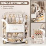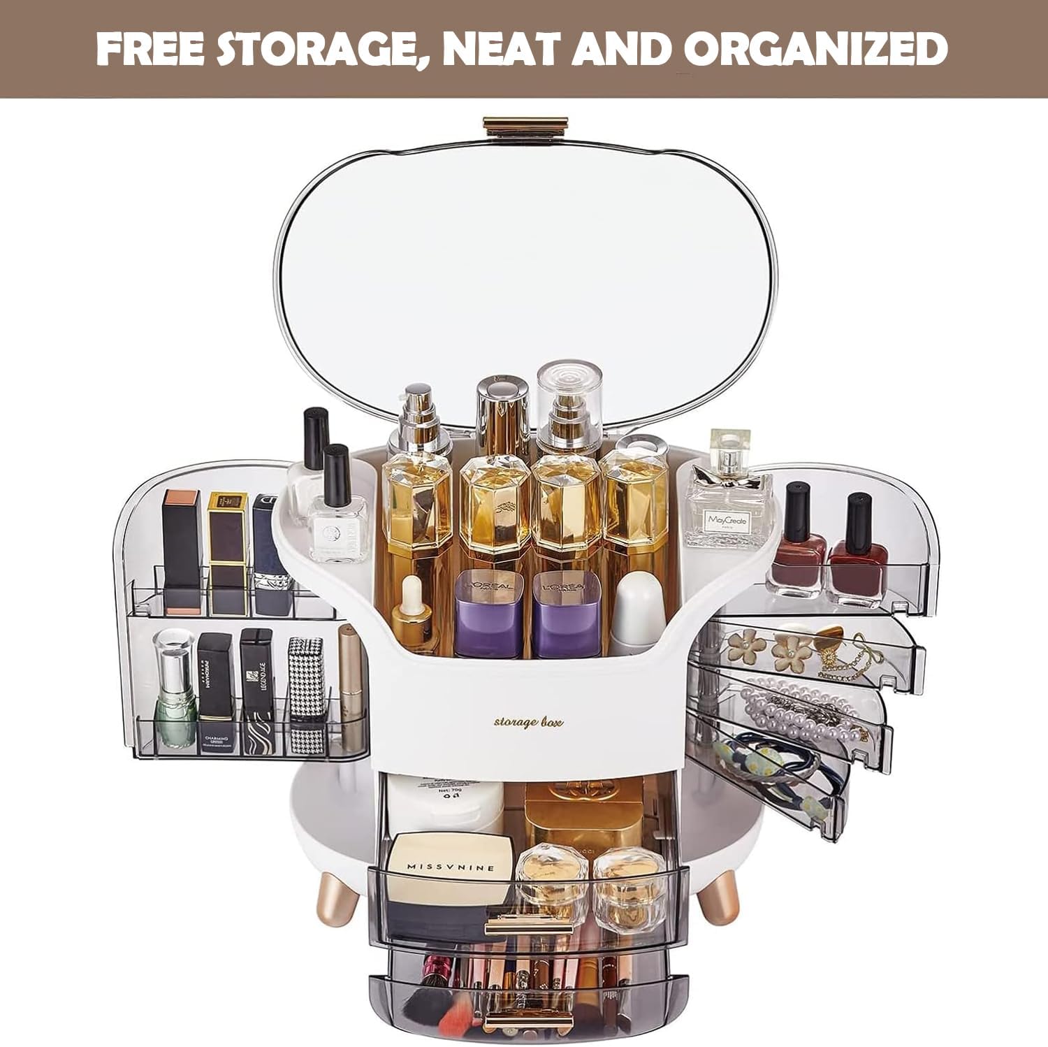 【Cosmetics Display Case】 There are 9 storage areas, including 2 drawers, 2 layers of lipstick storage compartments, 4 rotatable storage Spaces and a large makeup box to meet your needs of storing different sizes of goods. The tall big top can easily store large bottles(8.7 in). You can store all your daily skin care products and cosmetics without any problem.