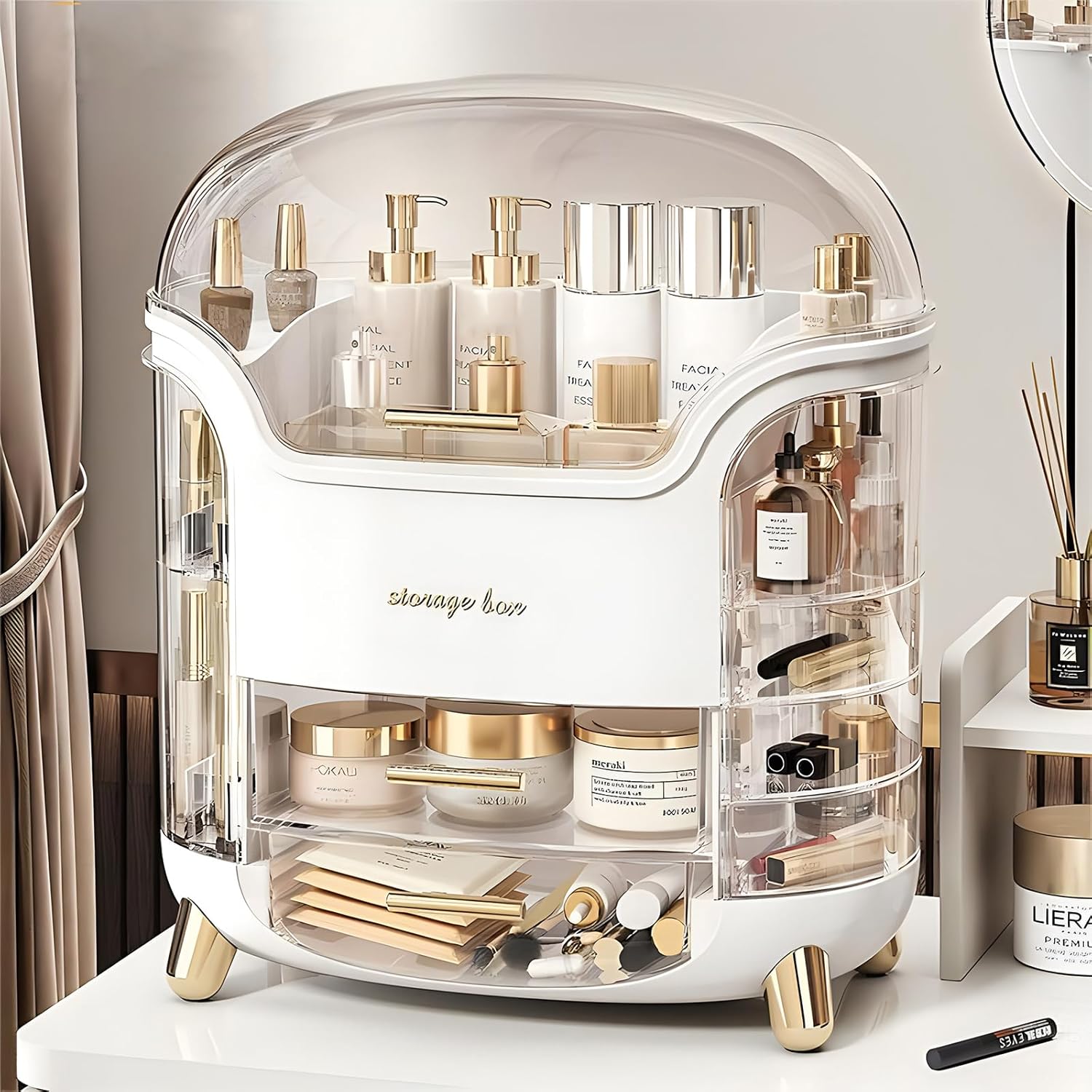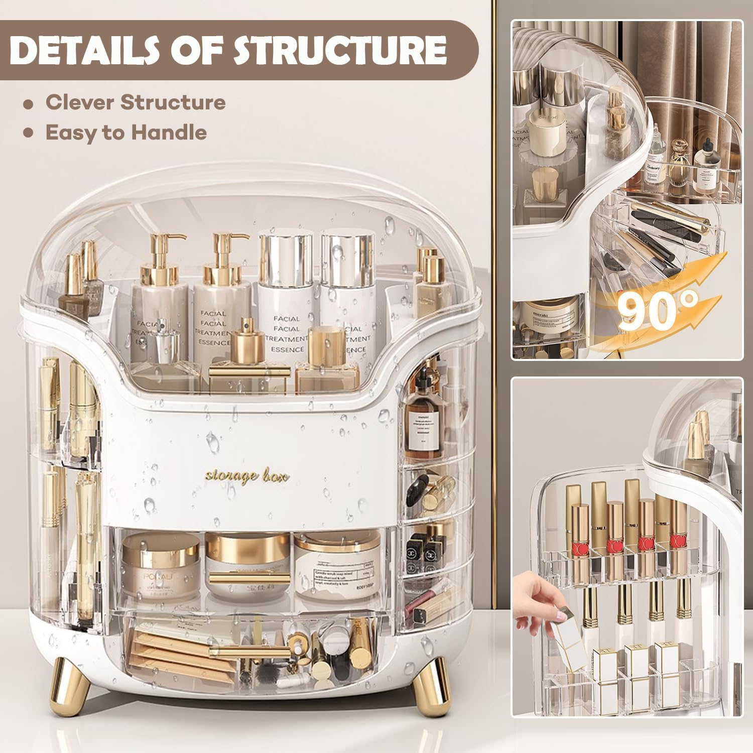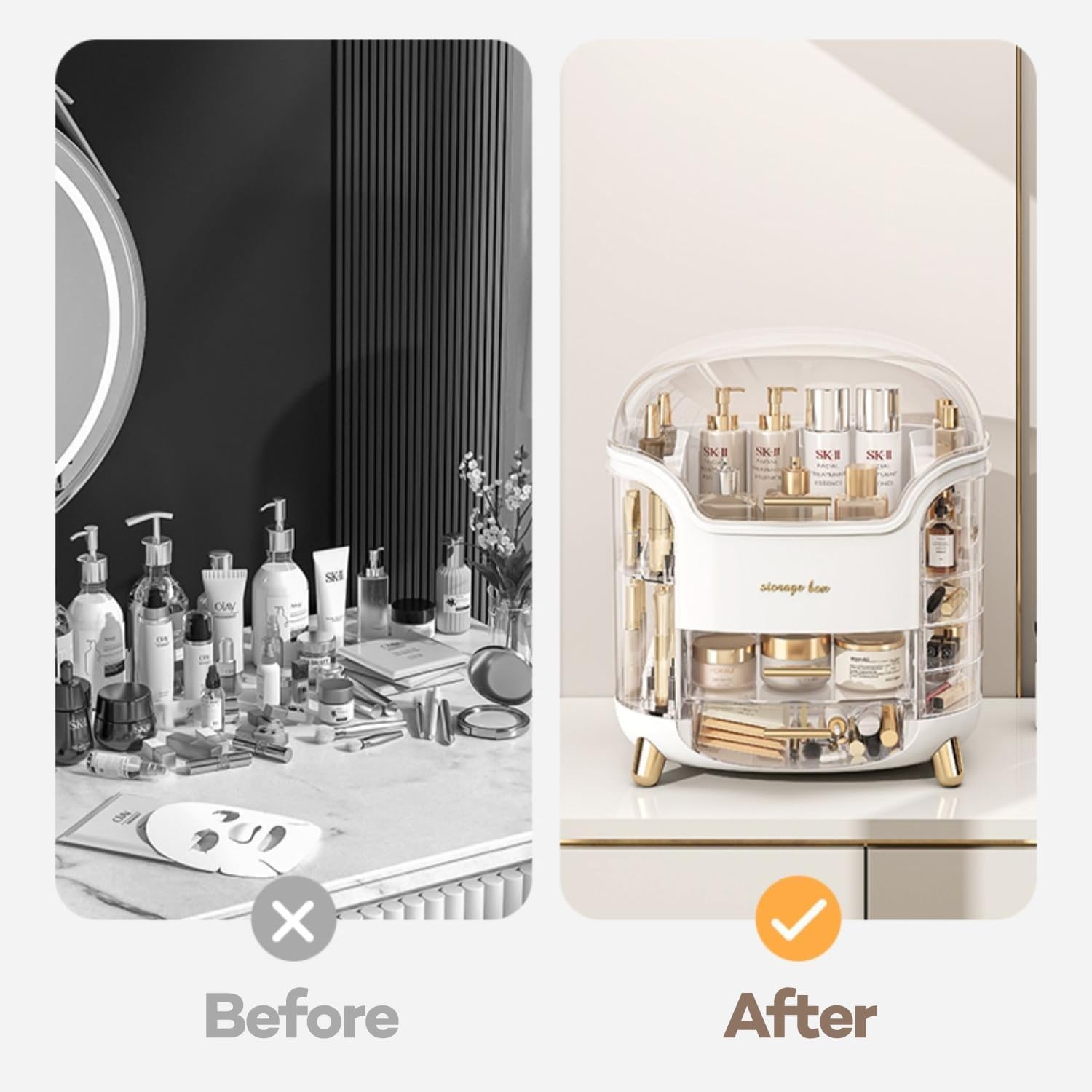 【Dust-Waterproof】 You can place it in the bathroom and bedroom, it will protect your cosmetics from dust and moisture. Decorated with a clear lid and drawers, the storage drawers are well divided to store lipsticks, makeup brushes, eyebrow pencils, foundation sticks, beauty gadgets, necklaces, rings.