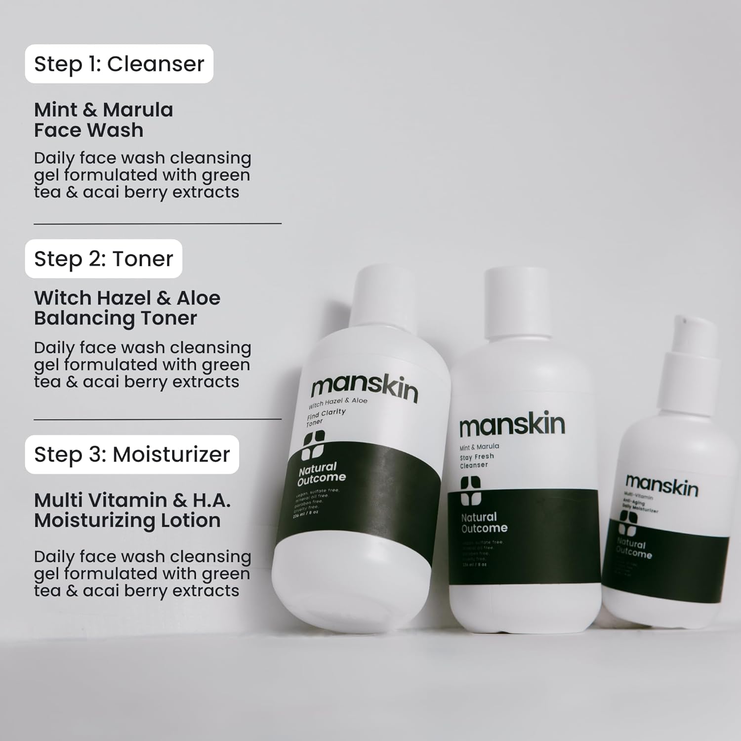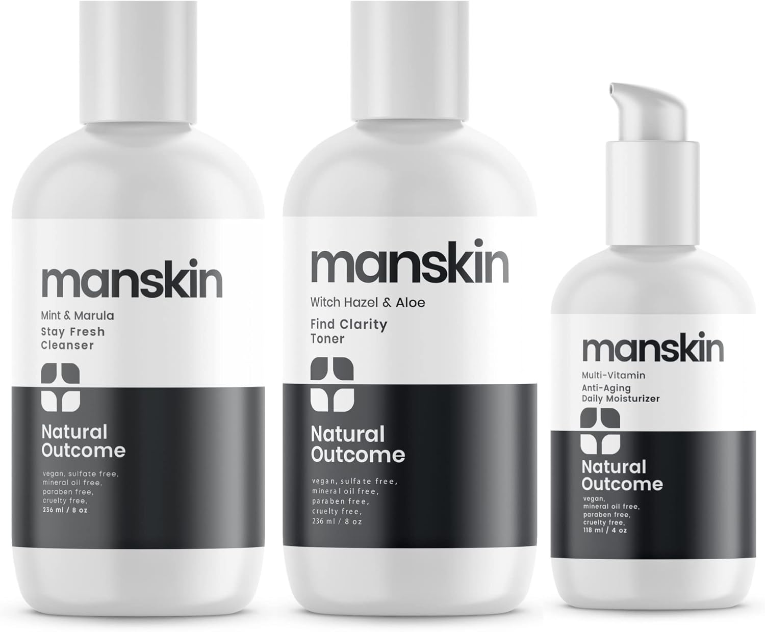 3 STEP FACE CARE KIT Natural Outcome daily facial kit for men contains our featured Man Skin products to help revive and refresh skin for anti aging and healing acne. Quality guaranteed premium mens face care full sized skin care products packed in a attractive box perfect for gifting to men for everyday grooming.